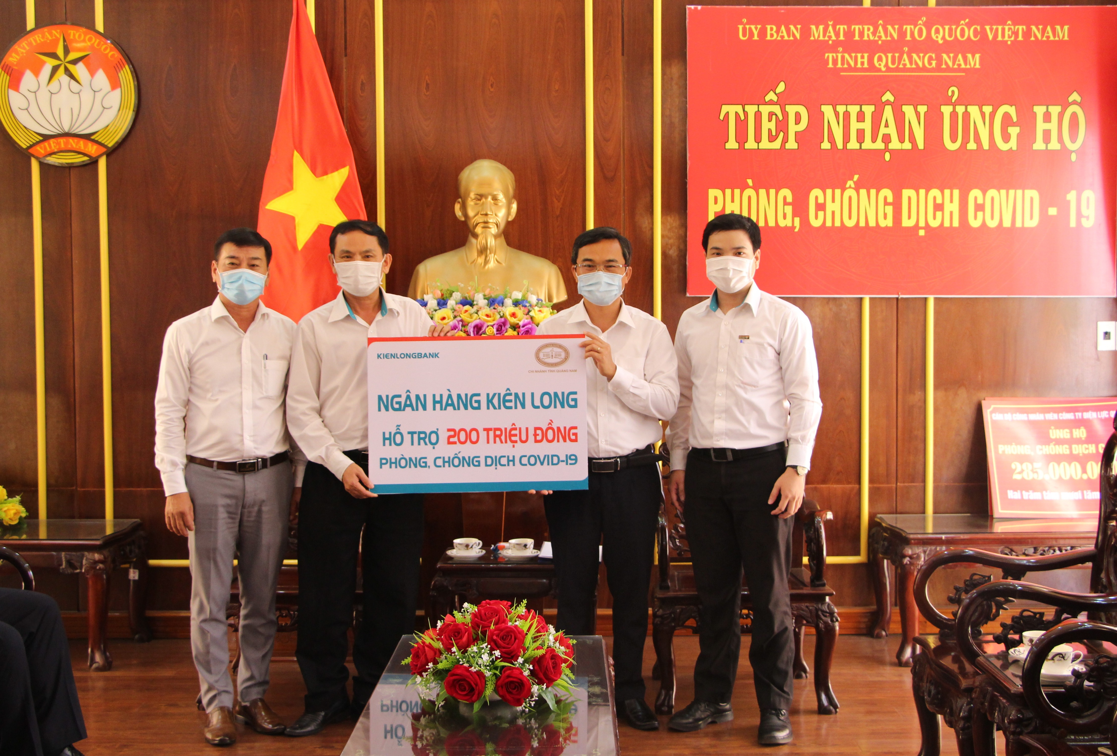Ông Nguyễn Hữu Khánh- Giám đốc Công ty Điện lực Quảng Nam thay mặt Lãnh đạo và cán bộ công nhân viên Công ty trao số tiền 285 triệu đồng; Lãnh đạo Ngân hàng Kiên Long- Chi nhanh Quảng Nam trao ủng hộ 200 triệu đồng cho Quỹ phòng, chống dịch bệnh Covid-19 với mong muốn chung tay góp sức cùng với chính quyền trong công tác phòng, chống dịch bệnh.