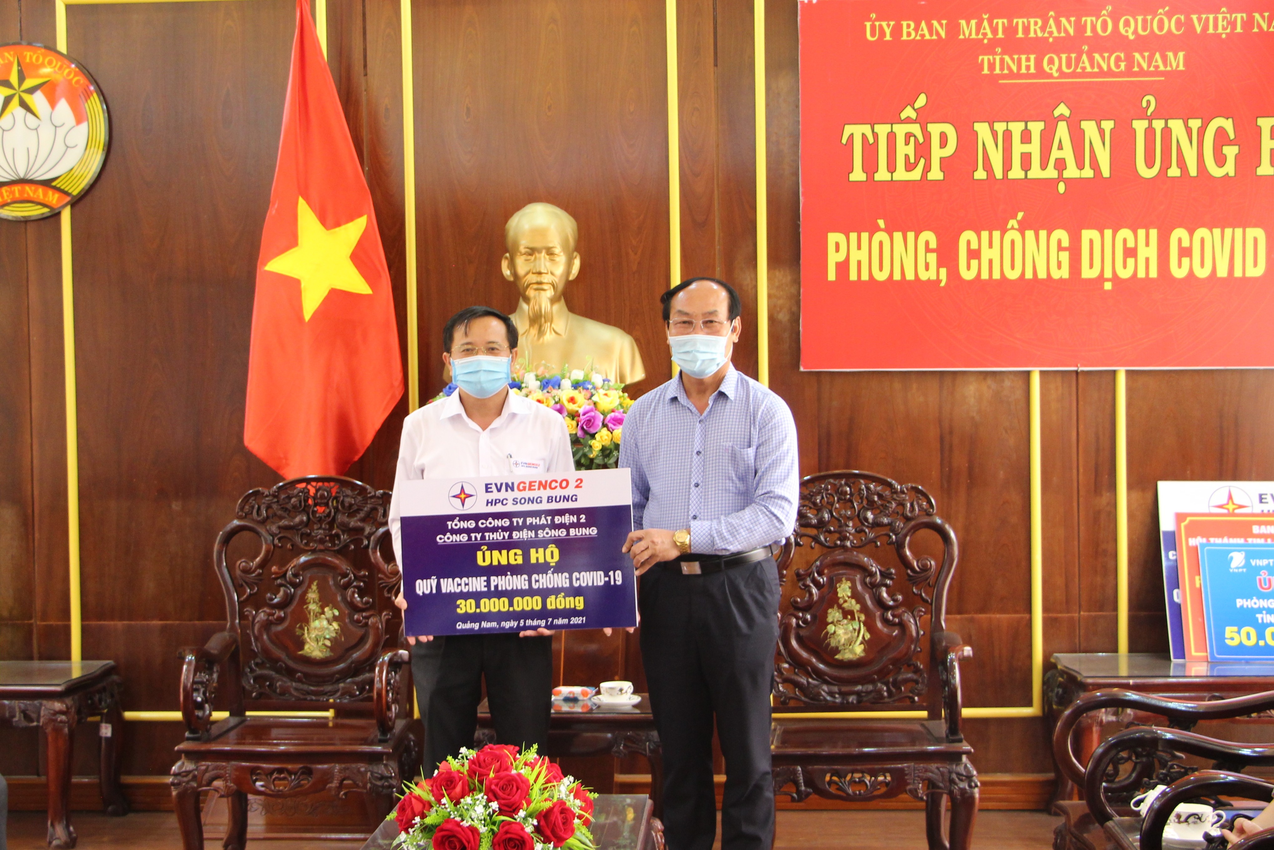 Chiều ngày 05/7/2021, đại diện Lãnh đạo Công ty Thủy điện Sông Bung đến trao 30 triệu đồng ủng hộ Quỹ Vacxin phòng, chống dịch Covid-19, ông Võ Xuân Ca- UVBTV, Chủ tịch Ủy ban MTTQ Việt Nam tỉnh đón tiếp.