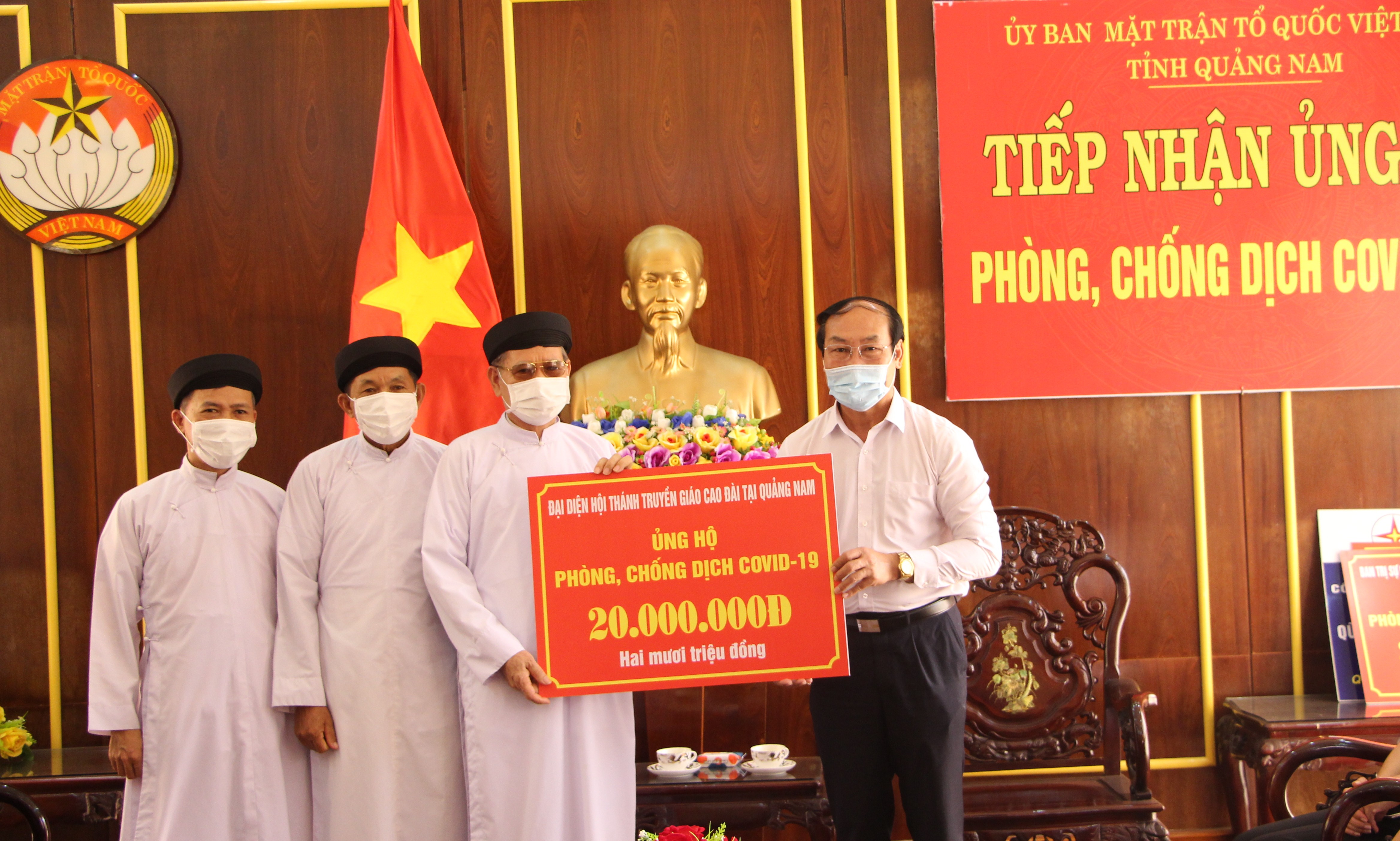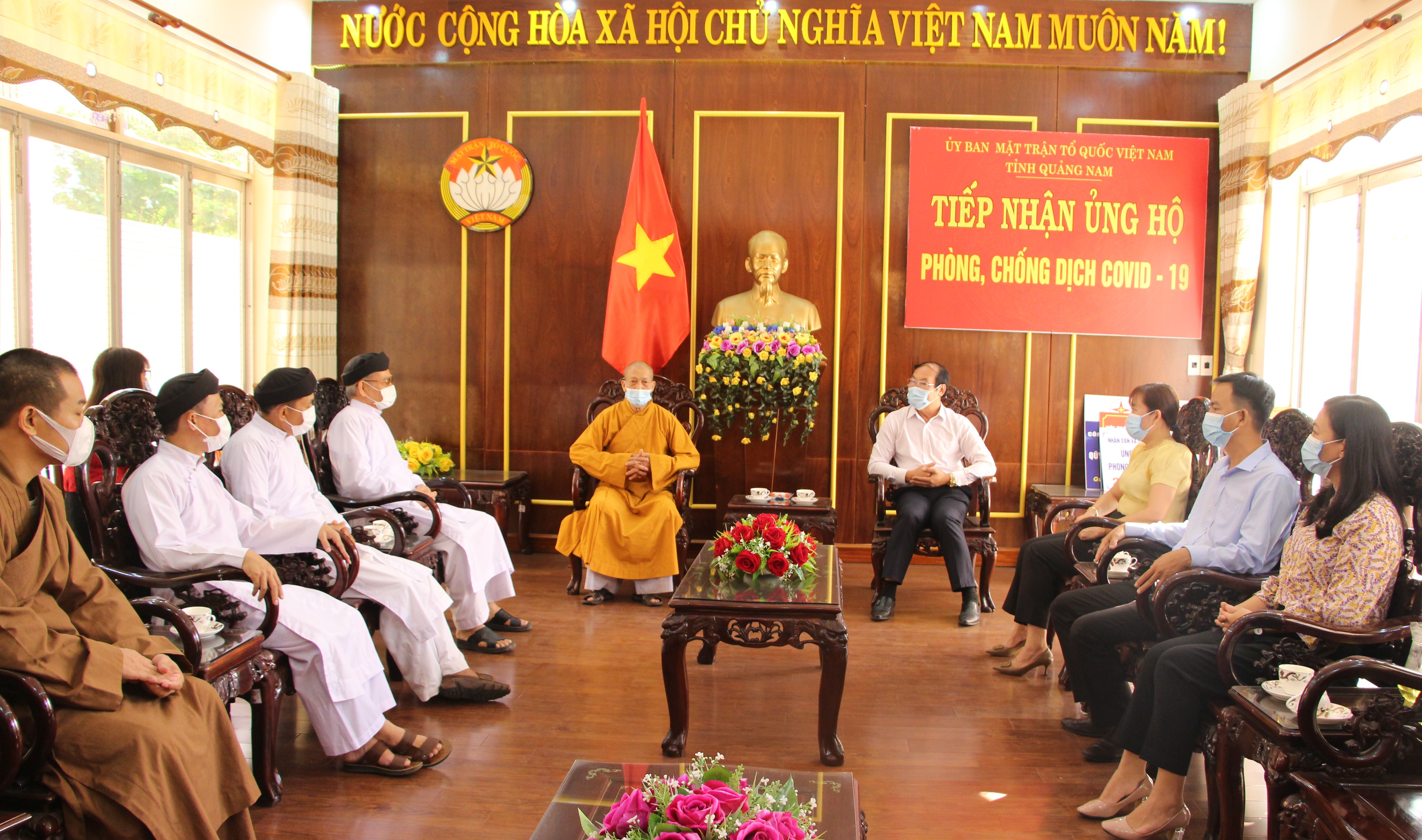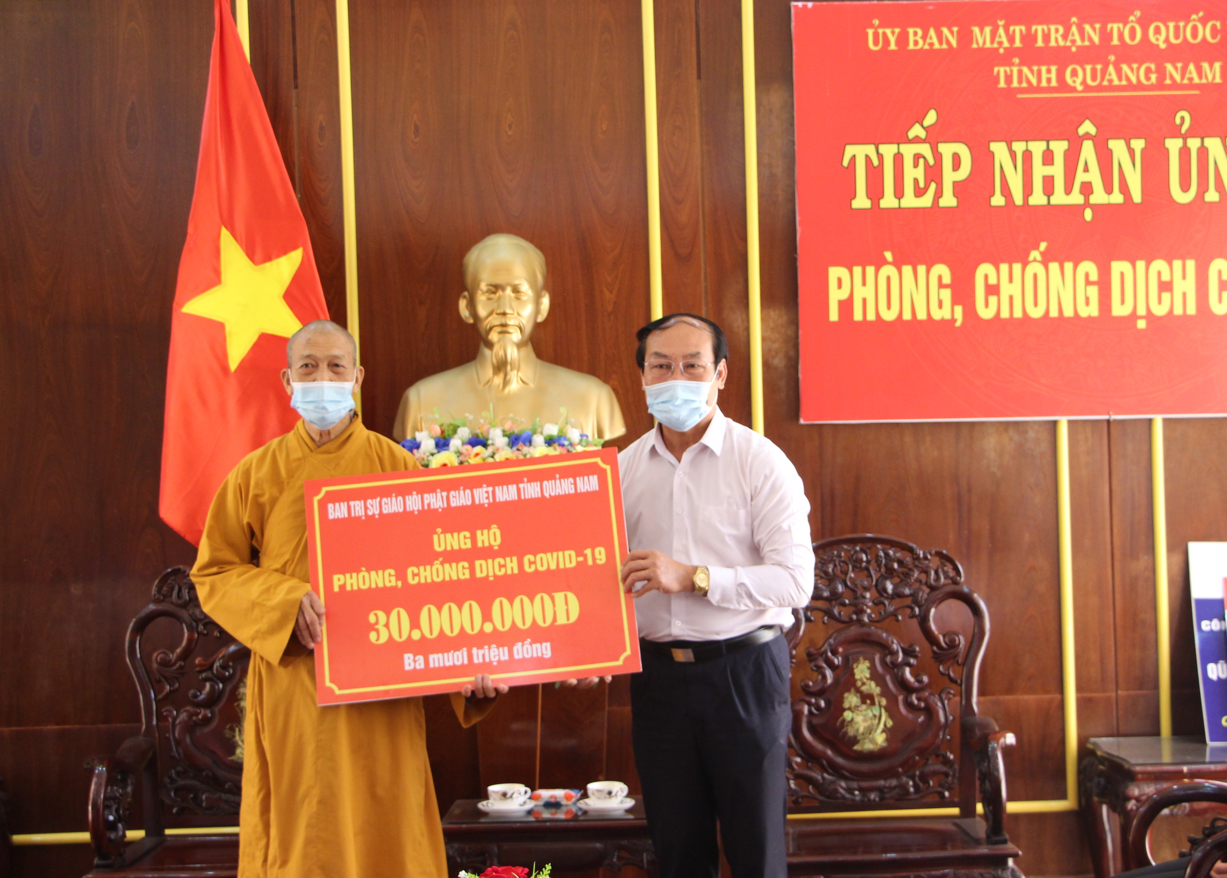 Sáng ngày 13/7/2021, Hòa thượng Thích Thiện Thành- Trưởng ban Trị sự Giáo hội Phật giáo tỉnh Quảng Nam và Giáo hữu Lê Đức Thuần- Chức sắc đại diện Hội Thánh Truyền giáo Cao Đài tại Quảng Nam thay mặt các chức sắc và bà con theo đạo Phật và đạo Cao Đài đến cơ quan Ủy ban MTTQ Việt Nam trao ủng hộ Quỹ phòng, chống dịch Covid-19. Ông Võ Xuân Ca- UVBTV, Chủ tịch Ủy ban MTTQ Việt Nam tỉnh tiếp nhận.
