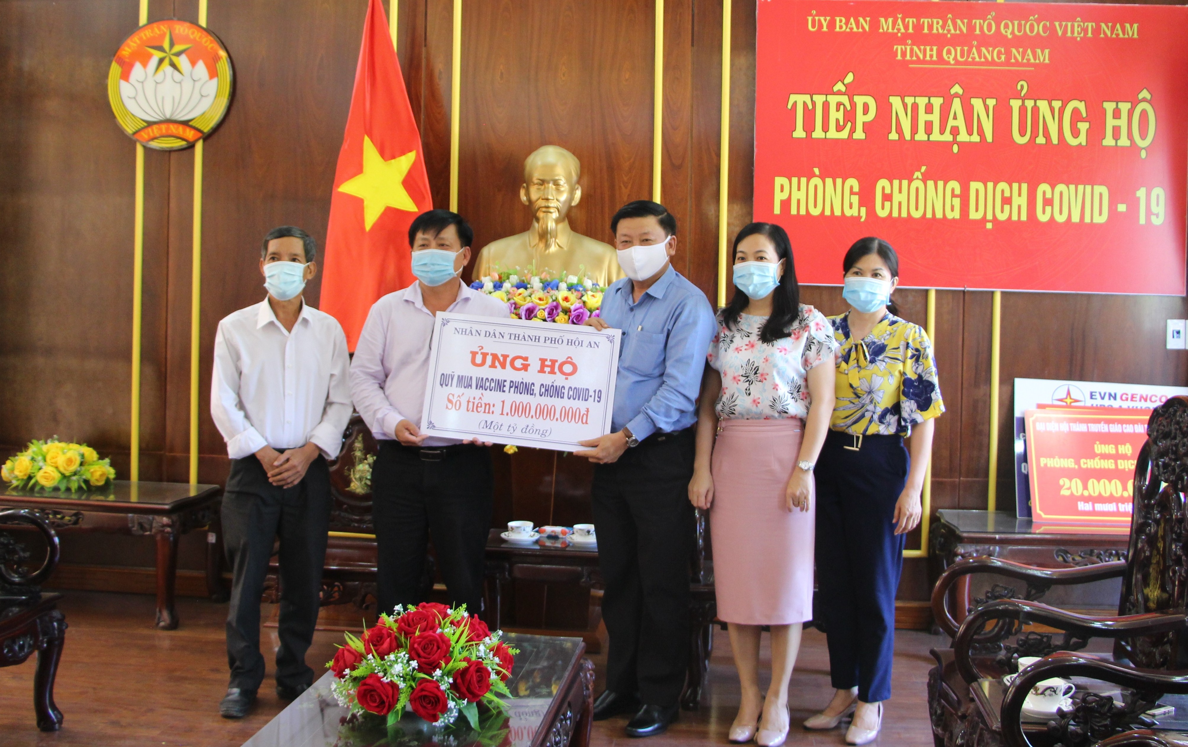Chiều ngày 14/7/2021, ông Lê Chơi- Phó Bí thư Thường trực Thành ủy và ông Đặng Hồng Lợi- Phó Chủ tịch Ủy ban MTTQ Việt Nam thành phố Hội An đại diện Lãnh đạo và Nhân dân thành phố đến cơ quan Ủy ban MTTQ Việt Nam tỉnh trao 1 tỷ đồng ủng hộ Quỹ Vacxin phòng, chống dịch Covid-19. Ông Lê Thái Bình- Phó Chủ tịch Ủy ban MTTQ Việt Nam tỉnh tiếp nhận.