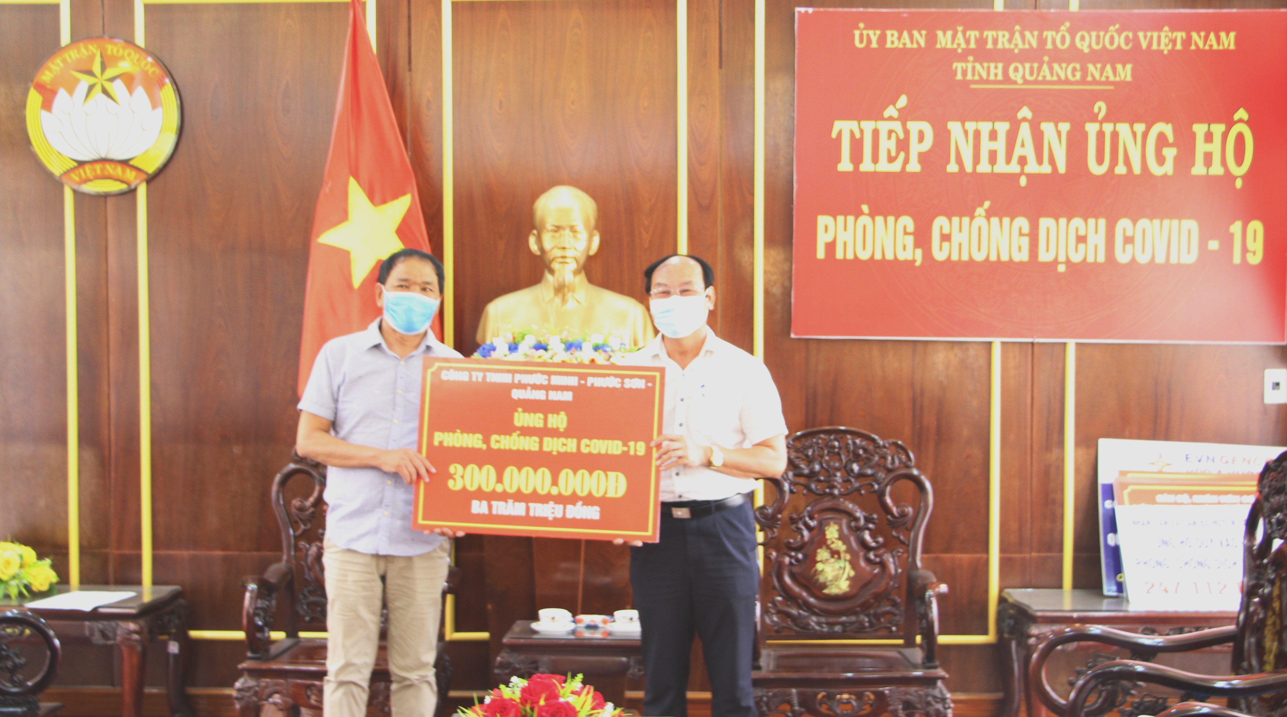 Chiều ngày 12/8/2021, đại diện Công ty TNHH Phước Minh, huyện Phước Sơn đến trao ủng hộ 300 triệu đồng vào Quỹ phòng, chống dịch bệnh Covid-19 của tỉnh. Ông Võ Xuân Ca- UVBTV, Chủ tịch Ủy ban MTTQ Việt Nam tỉnh tiếp nhận.