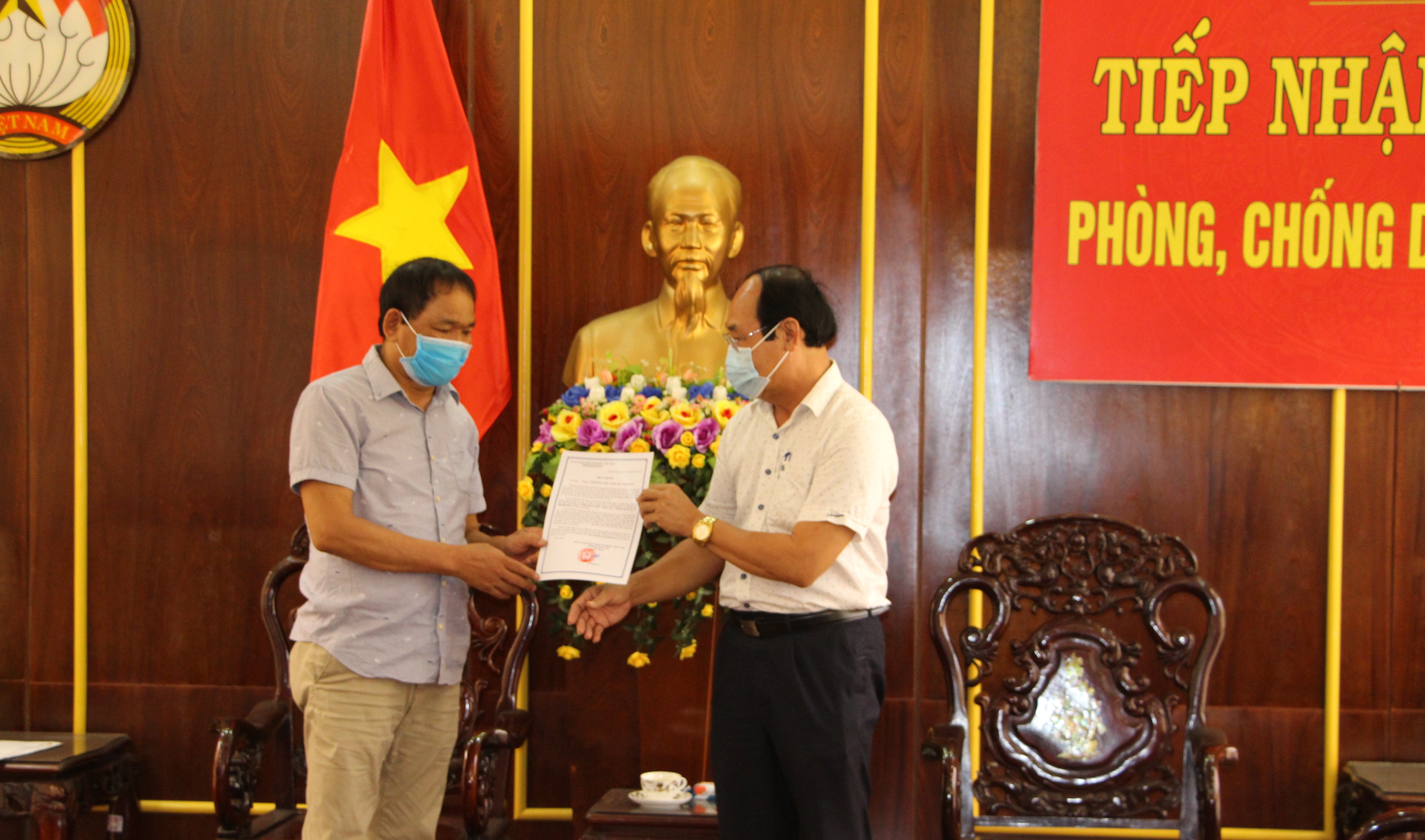Ông Võ Xuân Ca- UVBTV, Chủ tịch Ủy ban MTTQ Việt Nam tỉnh tiếp nhận tiền ủng hộ và trao Thư cảm ơn
