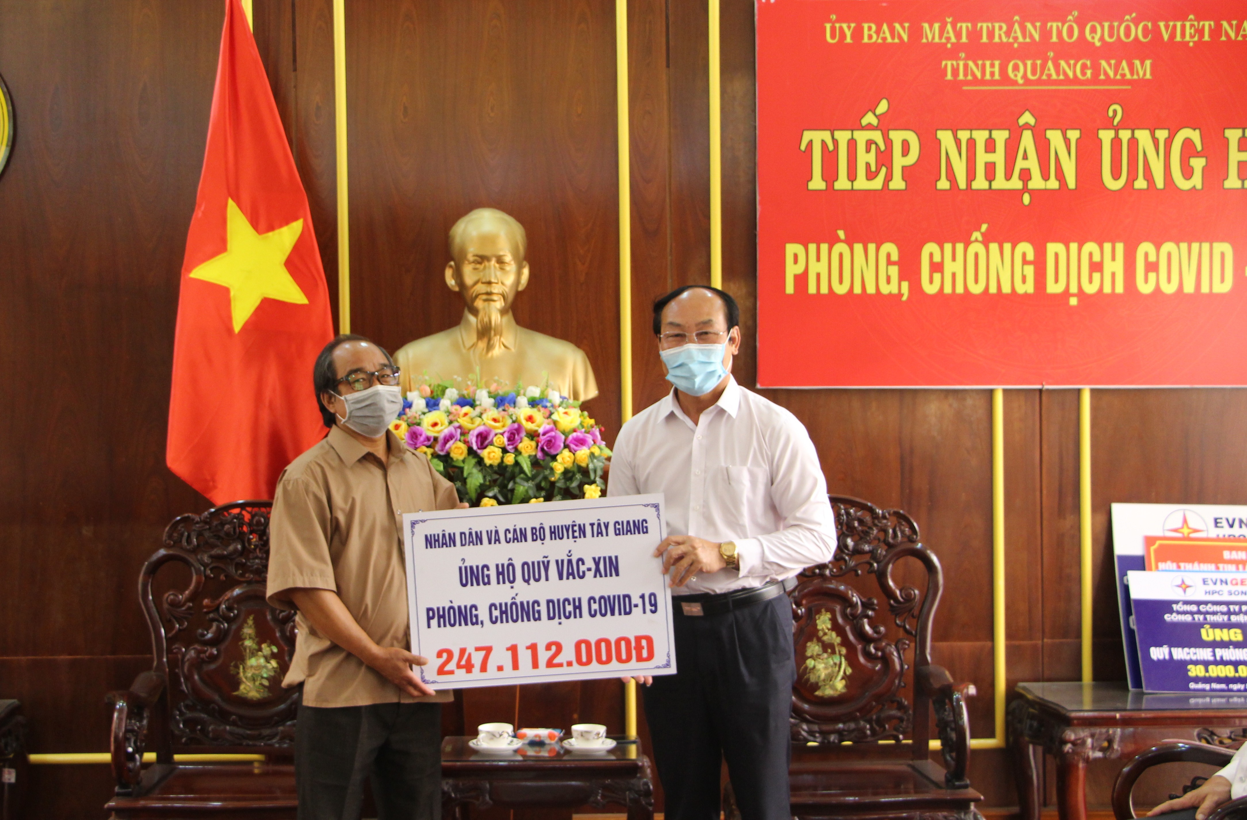 Chiều ngày 07/7/2021, ông Cơ Lâu Hạnh- UVBTV, Trưởng ban Dân vận Huyện ủy, Chủ tịch Ủy ban MTTQ Việt Nam huyện Tây Giang thay mặt Nhân dân và cán bộ huyện Tây Giang trao ủng hộ Quỹ vắcxin phòng, chống dịch Covid-19 của tỉnh số tiền 247.112.000đ. Ông Võ Xuân Ca- UVBTV, Chủ tịch Ủy ban MTTQ Việt Nam tỉnh tiếp nhận.
