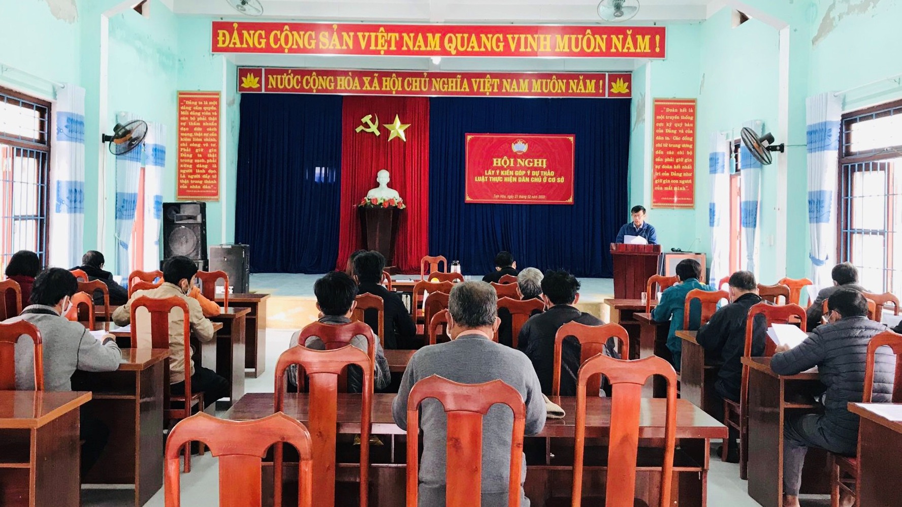 Toàn cảnh Hội nghị góp ý dự thảo Luật thực hiện dân chủ ở cơ sở tại xã Tam Hòa, huyện Núi Thành
