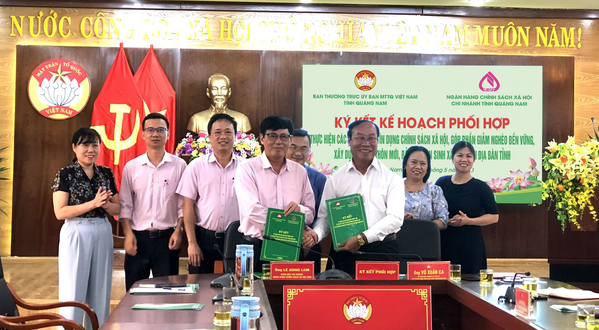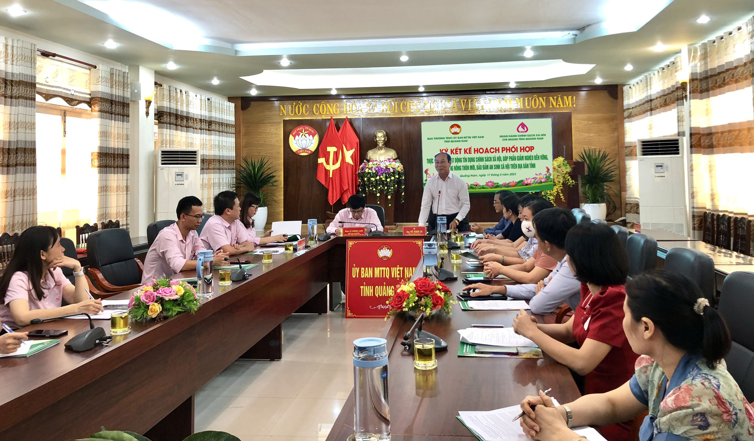 Chiều 17/5/2023, Ban Thường trực Uỷ ban MTTQ Việt Nam tỉnh tổ chức ký kết Kế hoạch phối hợp với Chi nhánh Ngân hàng Chính sách xã hội tỉnh về triển khai thực hiện Chương trình phối hợp số 10/CTrPH-MTTW-NHCS ngày 23/12/2022 giữa Ban Thường trực Ủy ban Trung ương Mặt trận Tổ quốc Việt Nam và Ngân hàng Chính sách xã hội (Chương trình phối hợp số 10). Ông Võ Xuân Ca, UVBTV Tỉnh uỷ - Chủ tịch Ủy ban MTTQ Việt Nam tỉnh và ông Lê Hùng Lam, Giám đốc Chi nhánh Ngân hàng Chính sách xã hội tỉnh Quảng Nam, chủ trì Hội nghị.