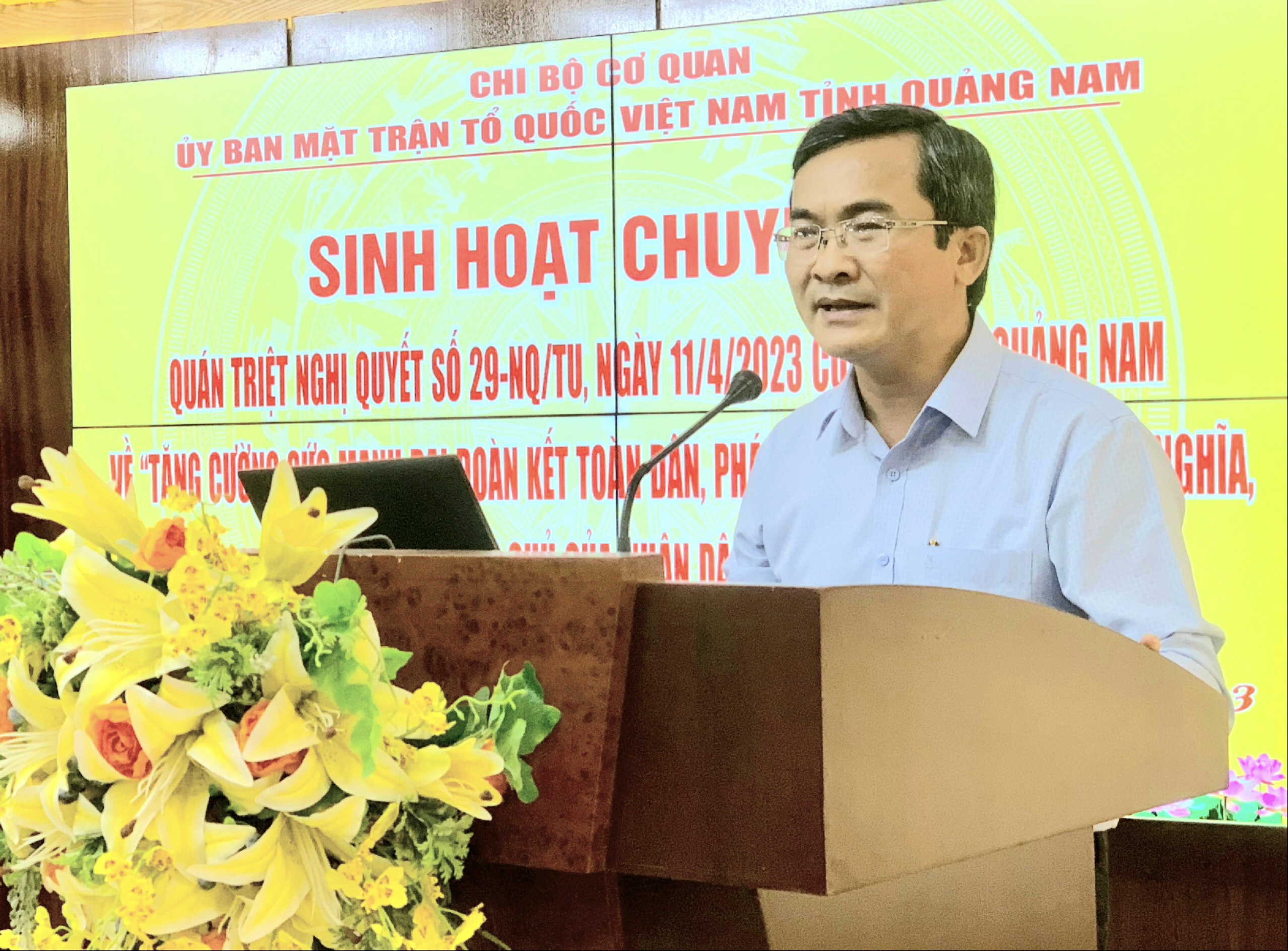 Đồng chí Nguyễn Phi Hùng - Phó Chủ tịch Thường trực Ủy ban MTTQ Việt Nam tỉnh, Bí thư chi bộ cơ quan trực tiếp quán triệt những nội dung trọng tâm, cốt lõi của Nghị quyết số 29-NQ/TU. Tham dự hội nghị có đại biểu đại diện lãnh đạo Ban Tuyên giáo Đảng ủy khối các cơ quan tỉnh.