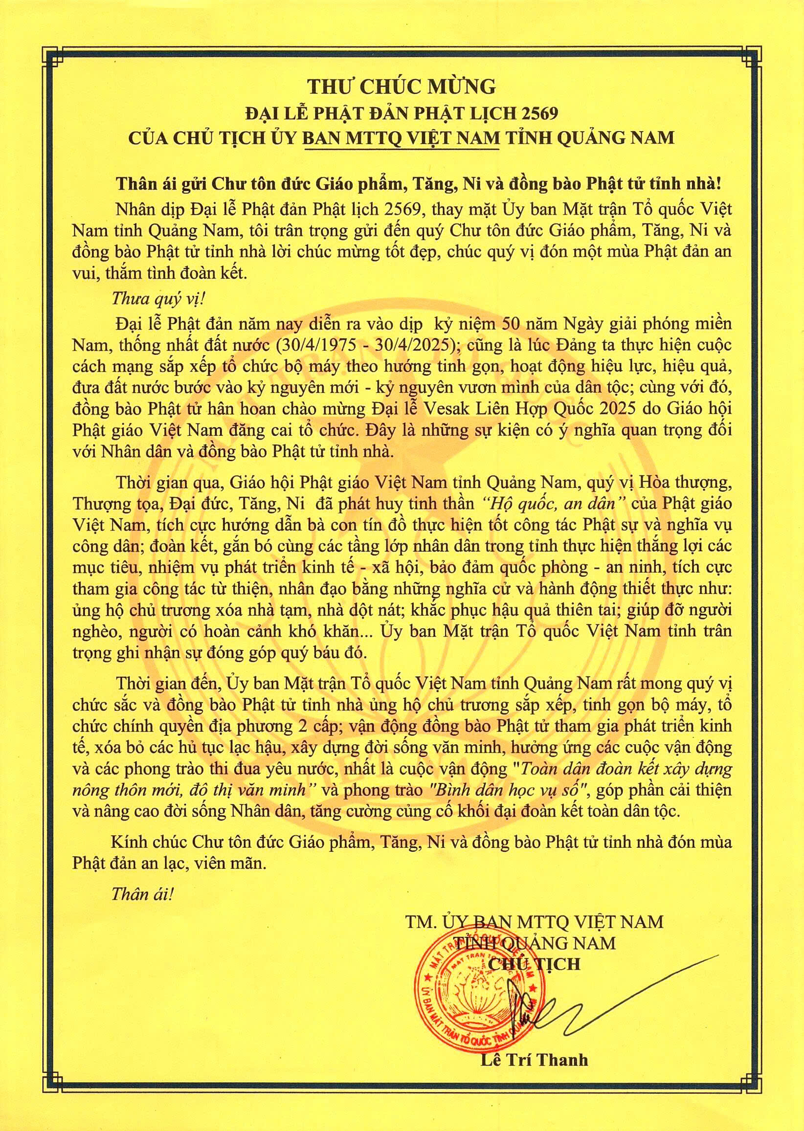 Thư chúc mừng Đại lễ Phật Đản Phật lịch 2569 của Chủ tịch Ủy ban MTTQ Việt Nam tỉnh Quảng Nam