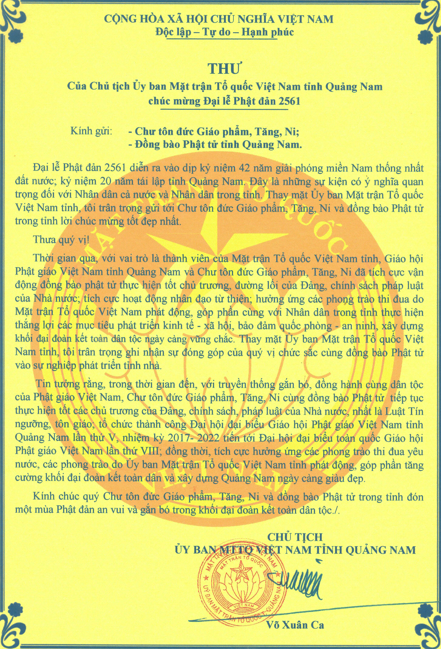 Thư của Chủ tịch Ủy ban MTTQ Việt Nam tỉnh Quảng Nam chúc mừng Đại lễ Phật đản 2561