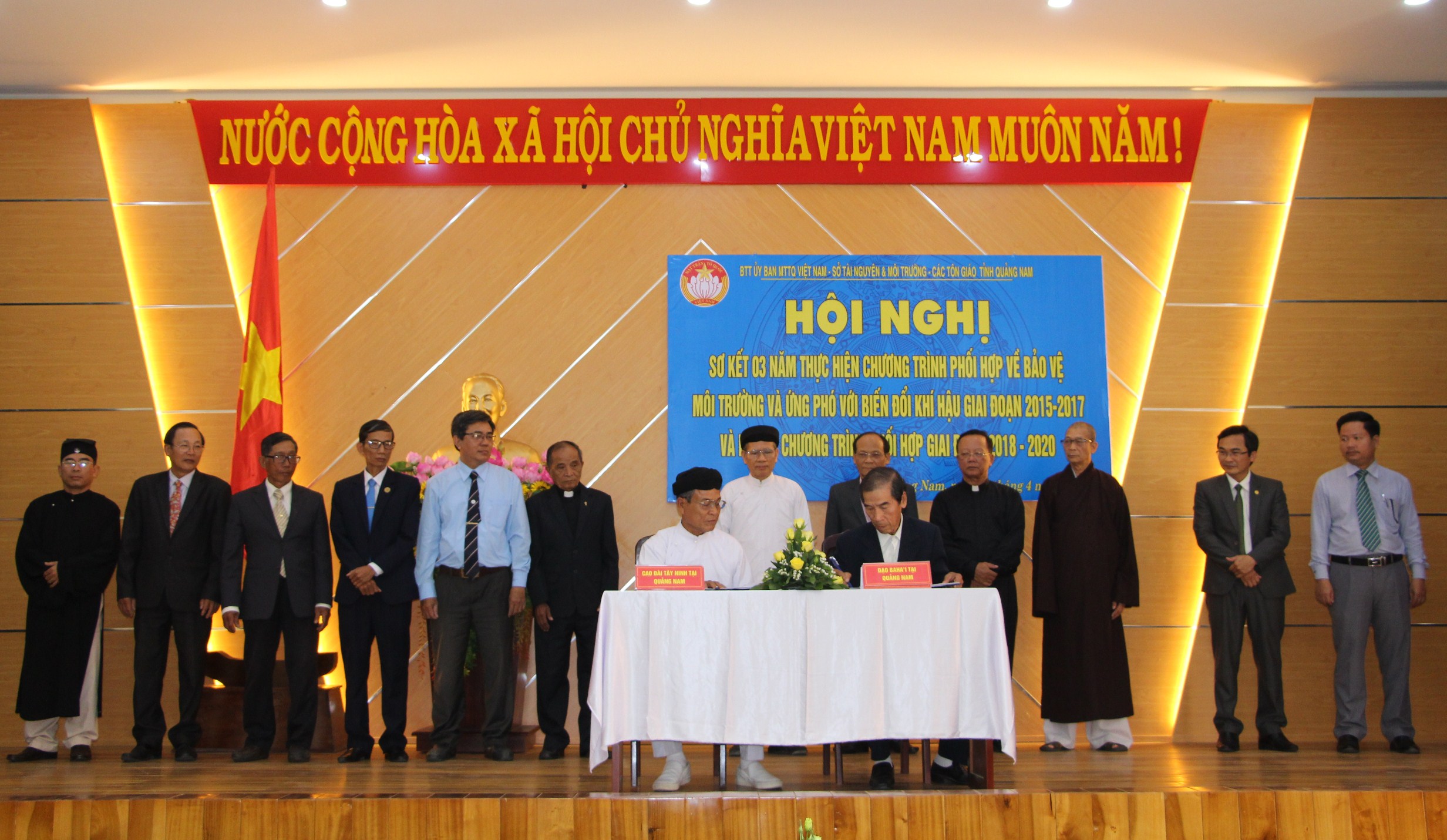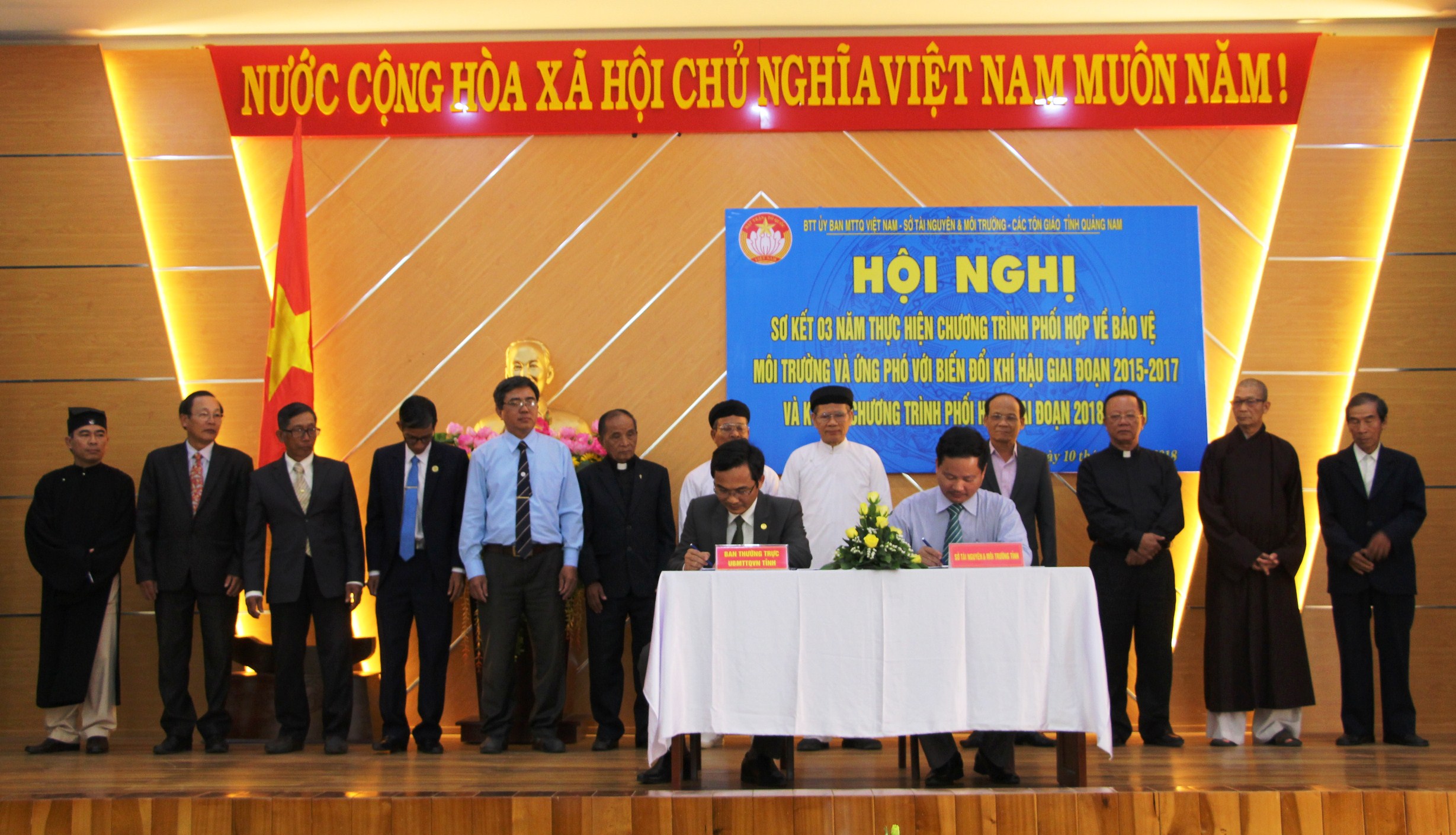 * Chiều cùng ngày, Ban Thường trực Ủy ban MTTQ Việt Nam tỉnh phối hợp với Sở Tài nguyên và môi trường, các tổ chức tôn giáo trên địa bàn tỉnh tổ chức Hội nghị sơ kết 03 năm thực hiện Chương trình phối hợp về bảo vệ môi trường, ứng phó với biến đổi khí hậu trong các tôn giáo giai đoạn 2015-2017 và ký kết Chương trình phối hợp về bảo vệ môi trường, ứng phó với biến đổi khí hậu giai đoạn 2018-2020.