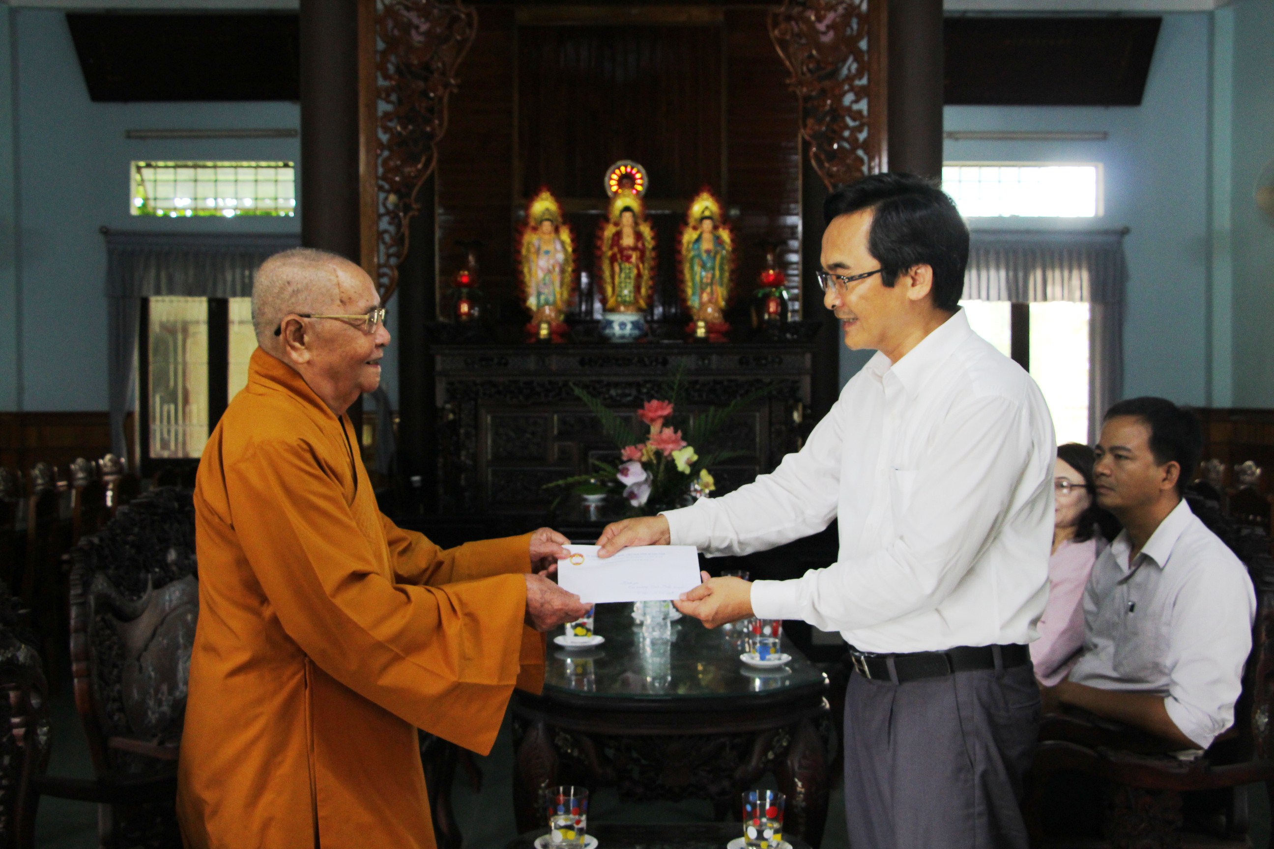 Ông Nguyễn Phi Hùng - Phó Chủ tịch TT UBMTTQVN tỉnh trao tiền hỗ trợ cho Hòa thượng Thích Thiện Duyên