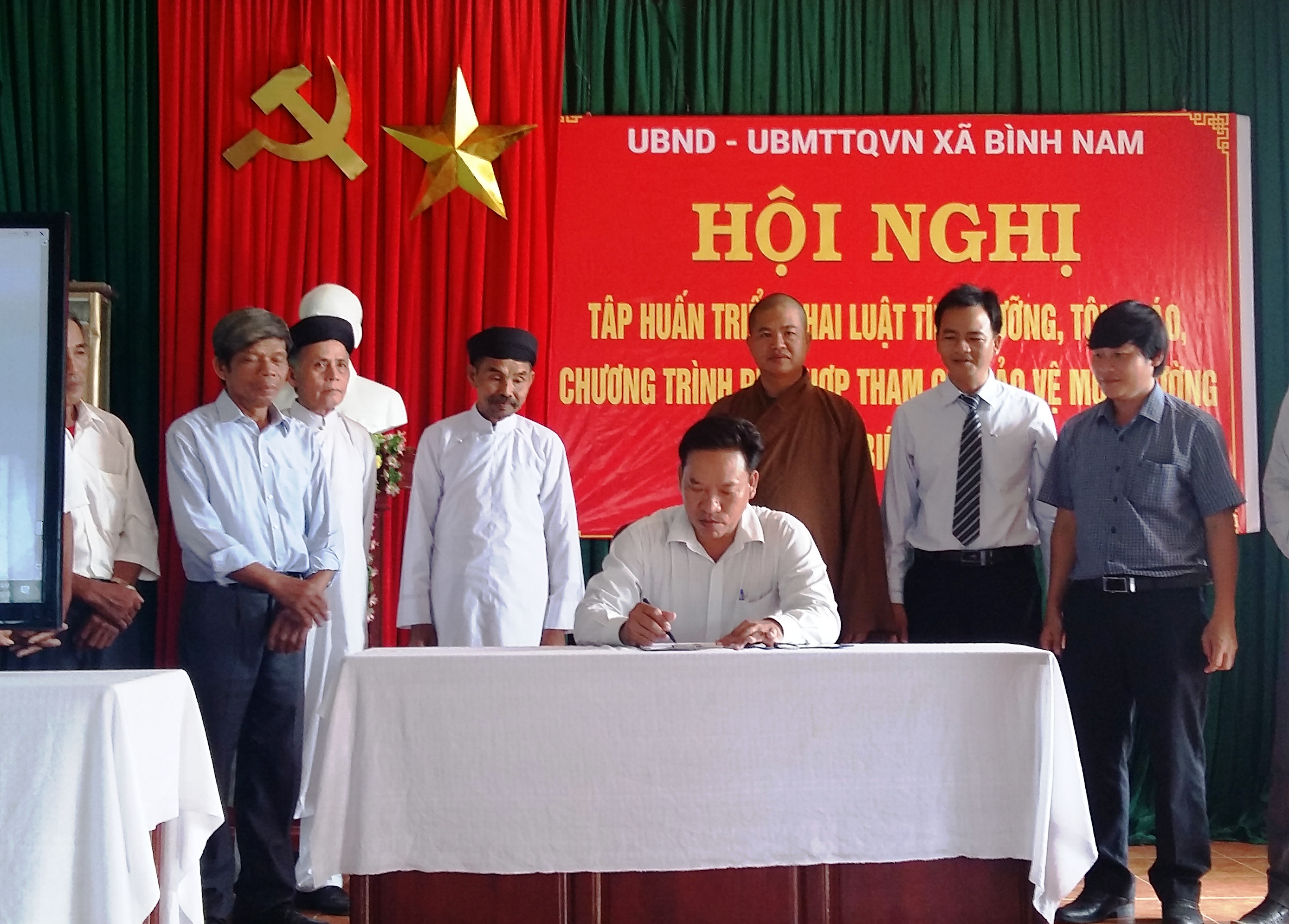 Ngày 08.6, Ban Thường trực Ủy ban MTTQ Việt Nam xã Bình Nam tổ chức Hội nghị giới thiệu Luật Tín ngưỡng, tôn giáo và ký kết chương trình phối hợp về bảo vệ môi trường, ứng phó với biến đổi khí hậu trong các tôn giáo. Tham dự có trên 100 đại biểu các tôn giáo trên địa bàn xã.