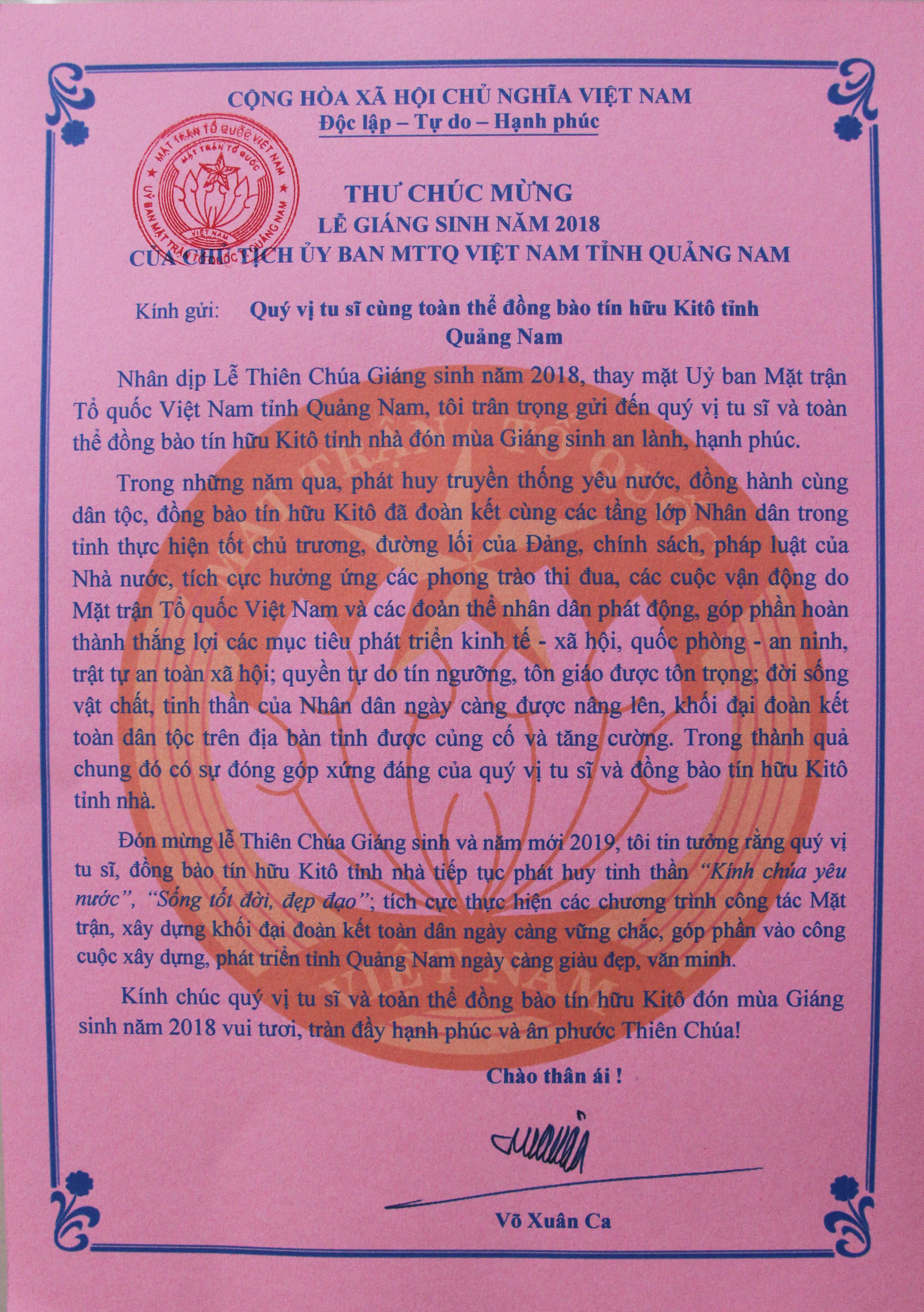 Thư chúc mừng Lễ Giáng sinh năm 2018 của Chủ tịch Ủy ban MTTQ Việt Nam tỉnh Quảng Nam