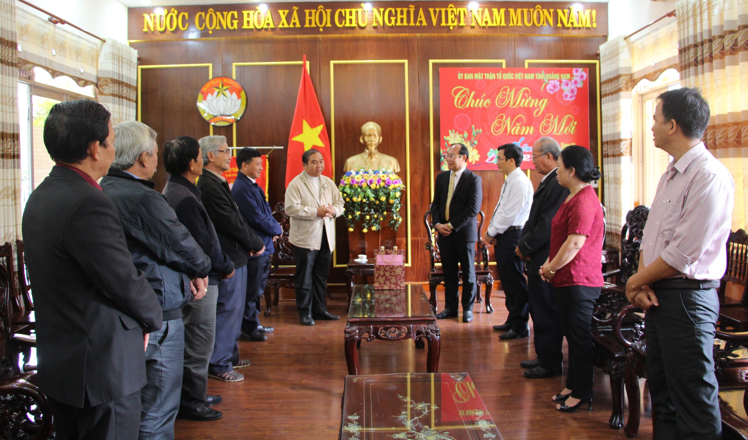 Thay mặt Ủy ban Đoàn kết Công giáo tỉnh, Linh mục Huỳnh Công Duy Minh gửi lời chúc đến lãnh đạo và toàn thể CBCC cơ quan Ủy ban MTTQ Việt Nam tỉnh một năm mới an khang, an lành và hạnh phúc. Đồng thời cảm ơn Ủy ban MTTQ Việt Nam tỉnh trong năm qua, với vai trò là cầu nối đã quan tâm, tạo điều kiện cho giáo dân thực hiện tốt các hoạt động tôn giáo, tín ngưỡng; khẳng định Ủy ban Đoàn kết Công giáo Việt Nam tỉnh sẽ tiếp tục tích cực vận động giáo dân sống tốt đời đẹp đạo, kính chúa yêu nước, vận động giáo dân thực hiện tốt các chủ trương, chính sách của Đảng, pháp luật của Nhà nước; các phong trào thi đua yêu nước, các cuộc vận động do Mặt trận Tổ quốc phát động…