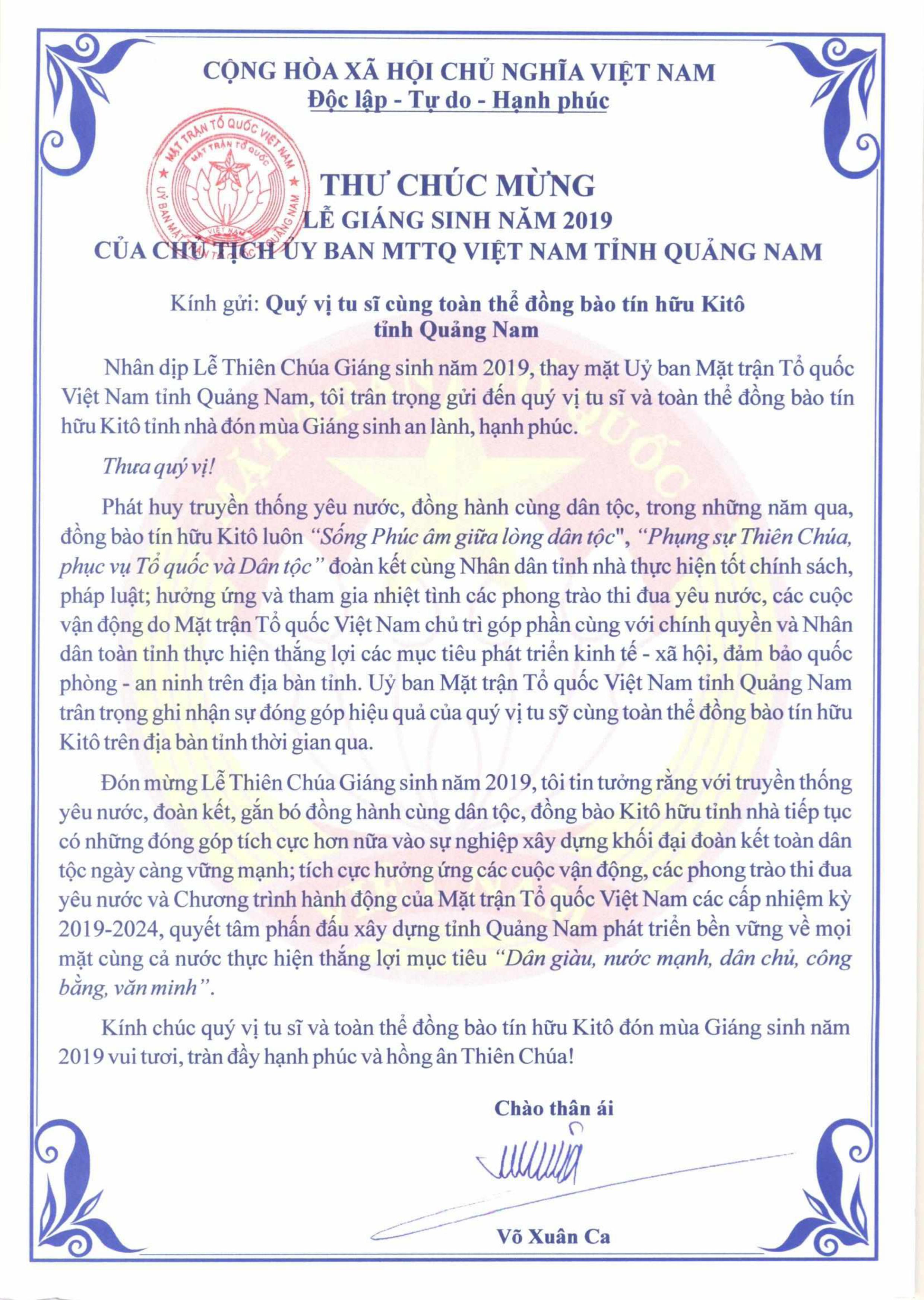 Thư của Chủ tịch Ủy ban MTTQ Việt Nam tỉnh Quảng Nam chúc mừng Lễ Giáng sinh 2019