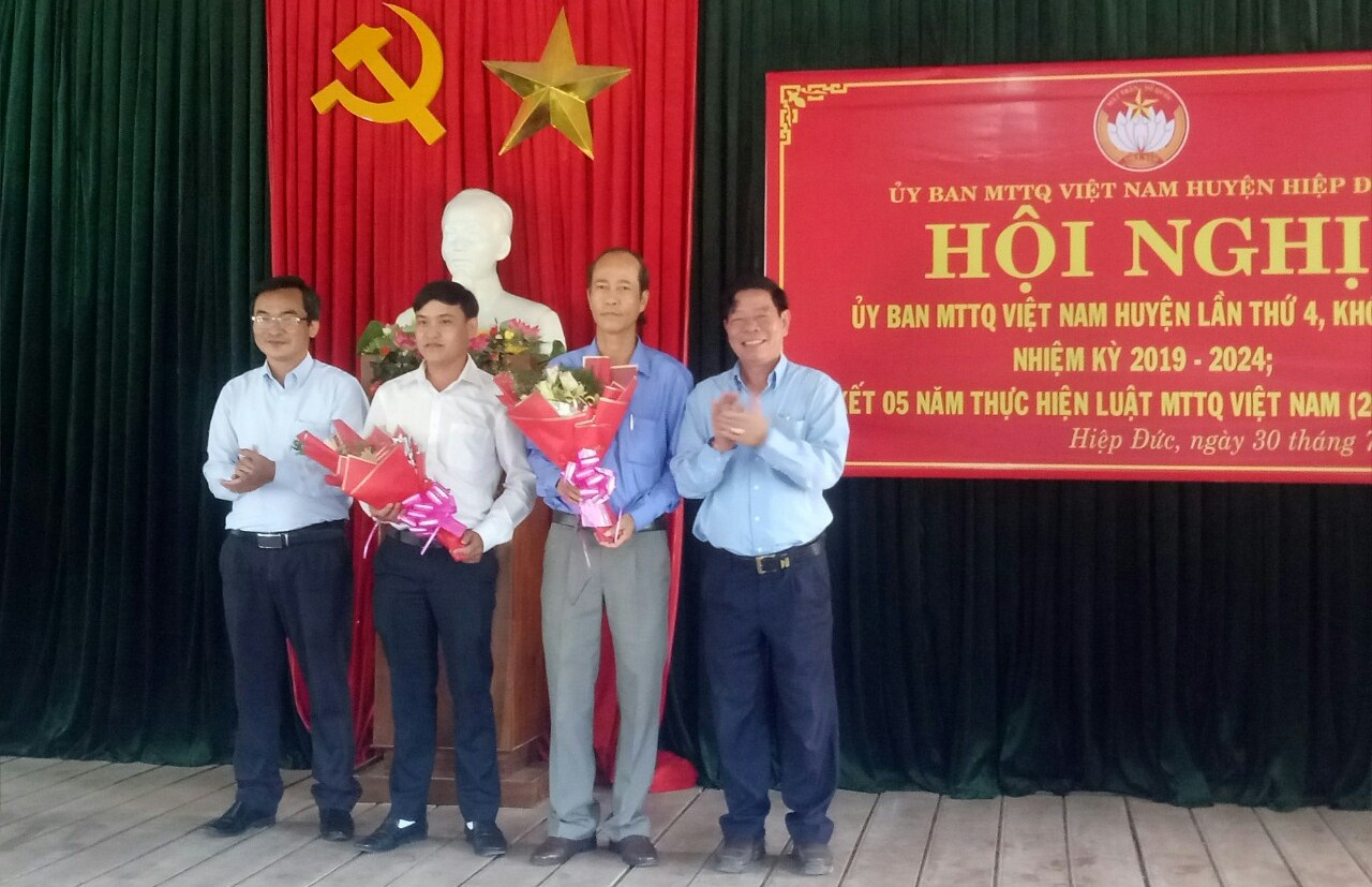 Hội nghị trao hoa cho ông Huỳnh Năm- Chủ tịch Ủy ban MTTQ Việt Nam huyện Hiệp Đức