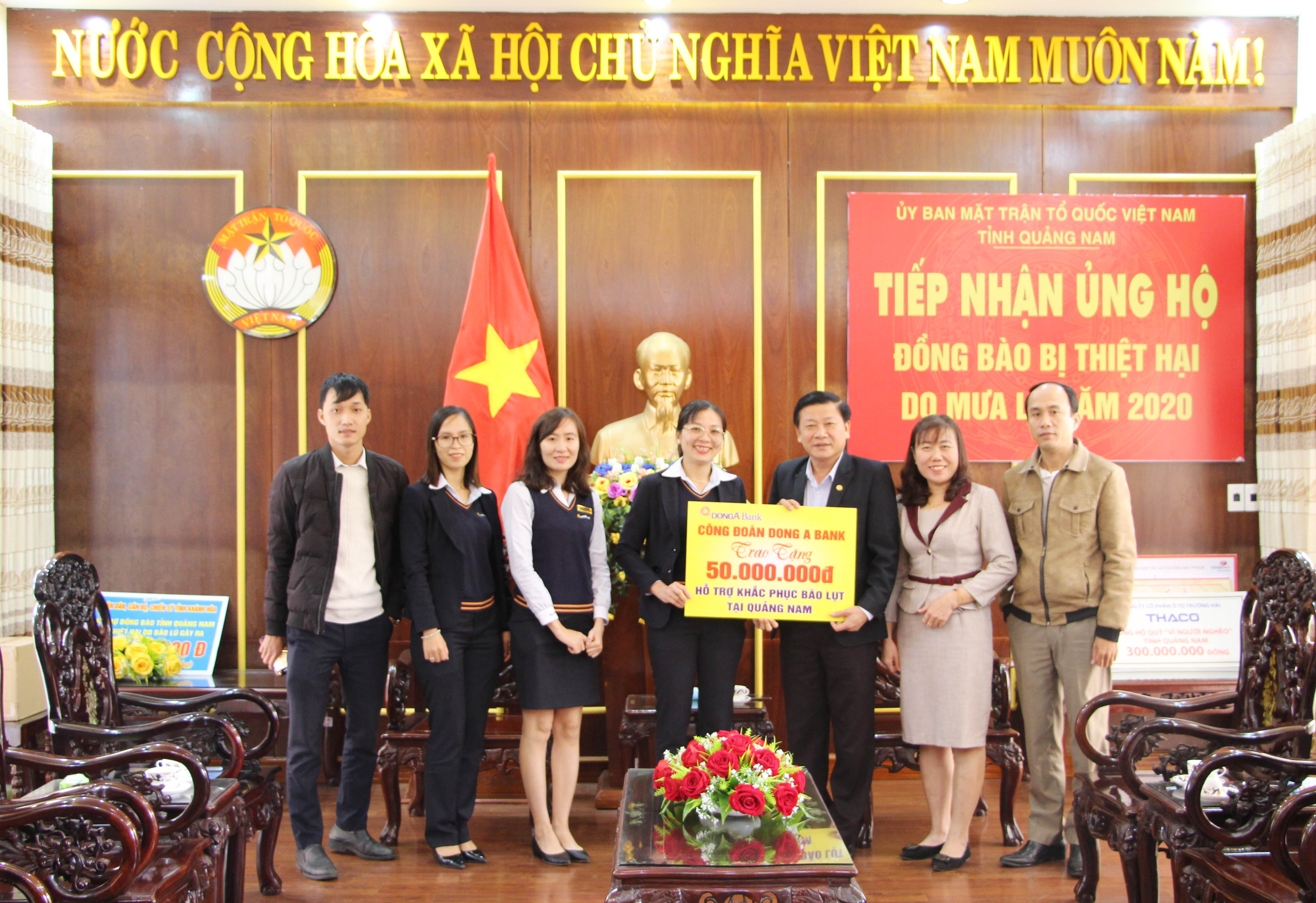 Sáng ngày 31/12, Bà Võ Thị Mỹ Hân, Trưởng phòng Quản trị - Tổng hợp, Chủ tịch Công đoàn Ngân hàng Đông Á Chi nhánh Quảng Nam đến trao 50 triệu đồng ủng hộ đồng bào Quảng Nam bị thiệt hại trong cơn bão lũ. Tiếp đoàn có ông Lê Thái Bình- Phó Chủ tịch Ủy ban MTTQ Việt Nam tỉnh Quảng Nam.
