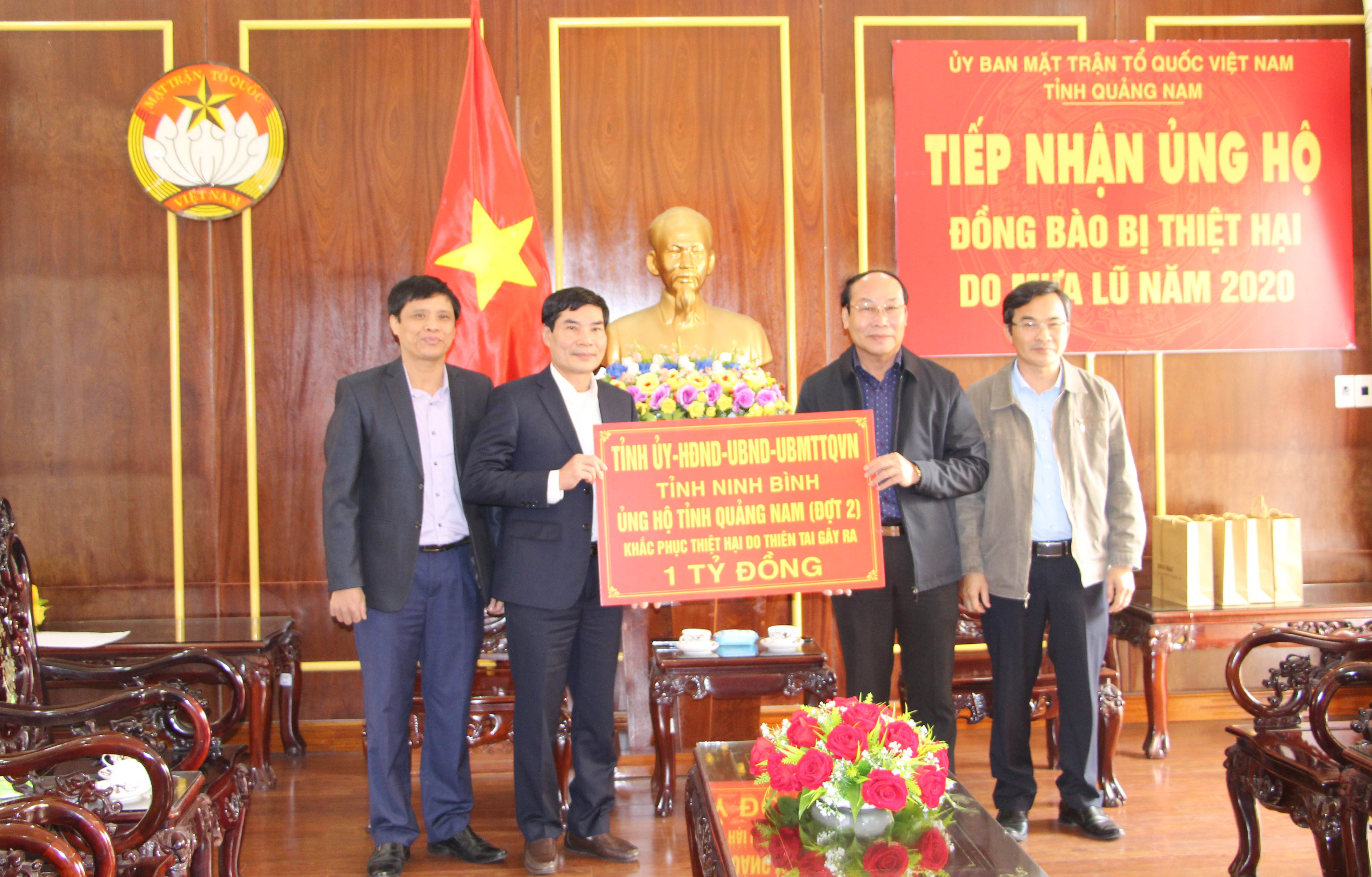Ông Võ Xuân Ca, UVBTV Tỉnh ủy, Chủ tịch Ủy ban MTTQ Việt Nam tỉnh trân trọng những tình cảm của Đảng bộ, Chính quyền tỉnh Ninh Bình đã có sự hỗ trợ kịp thời với tinh thần tương thân tương ái, chia sẻ giúp Quảng Nam khi hoạn nạn. Với số tiền này, tỉnh Quảng Nam tiếp tục tập trung hỗ trợ khắc phục nhà ở, đời sống cho bà con bị ảnh hưởng, thăm hỏi, hỗ trợ các gia đình để tạo điều kiện để bà con vượt qua giai đoạn khó khăn và ổn định cuộc sống.