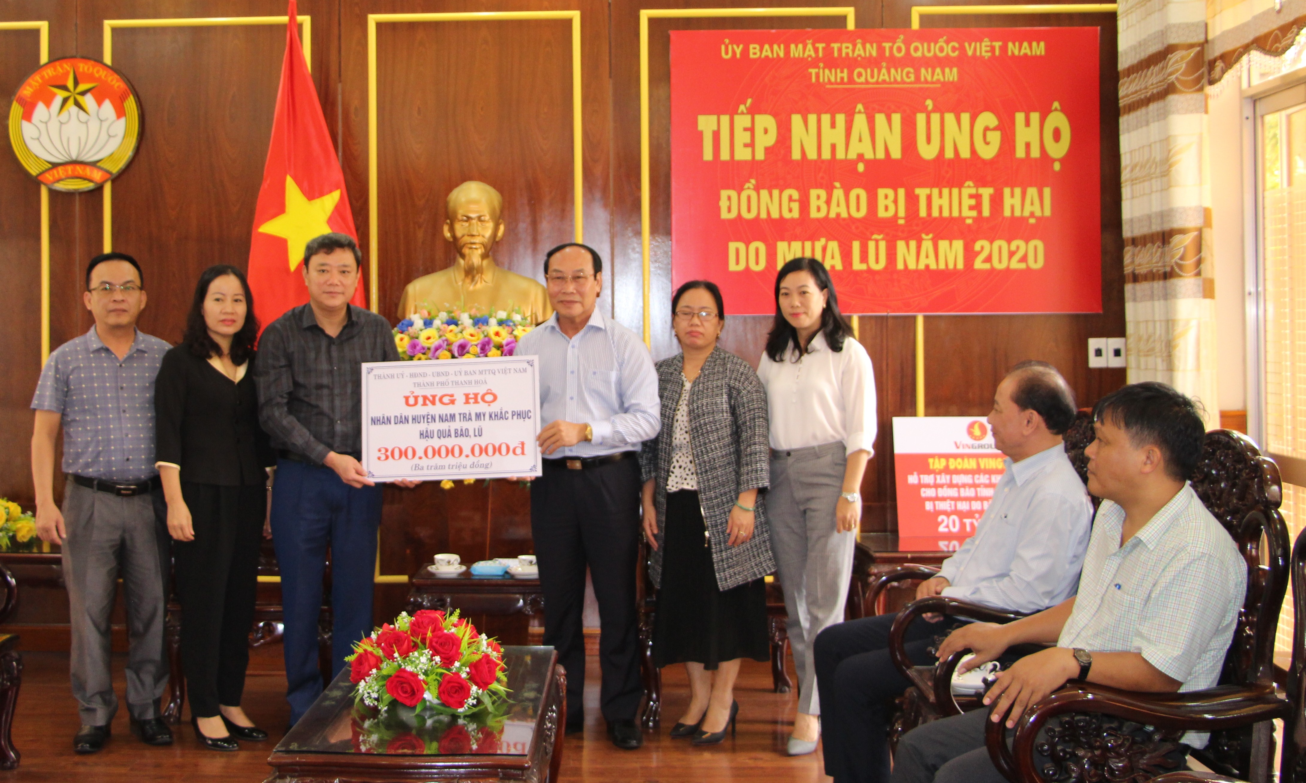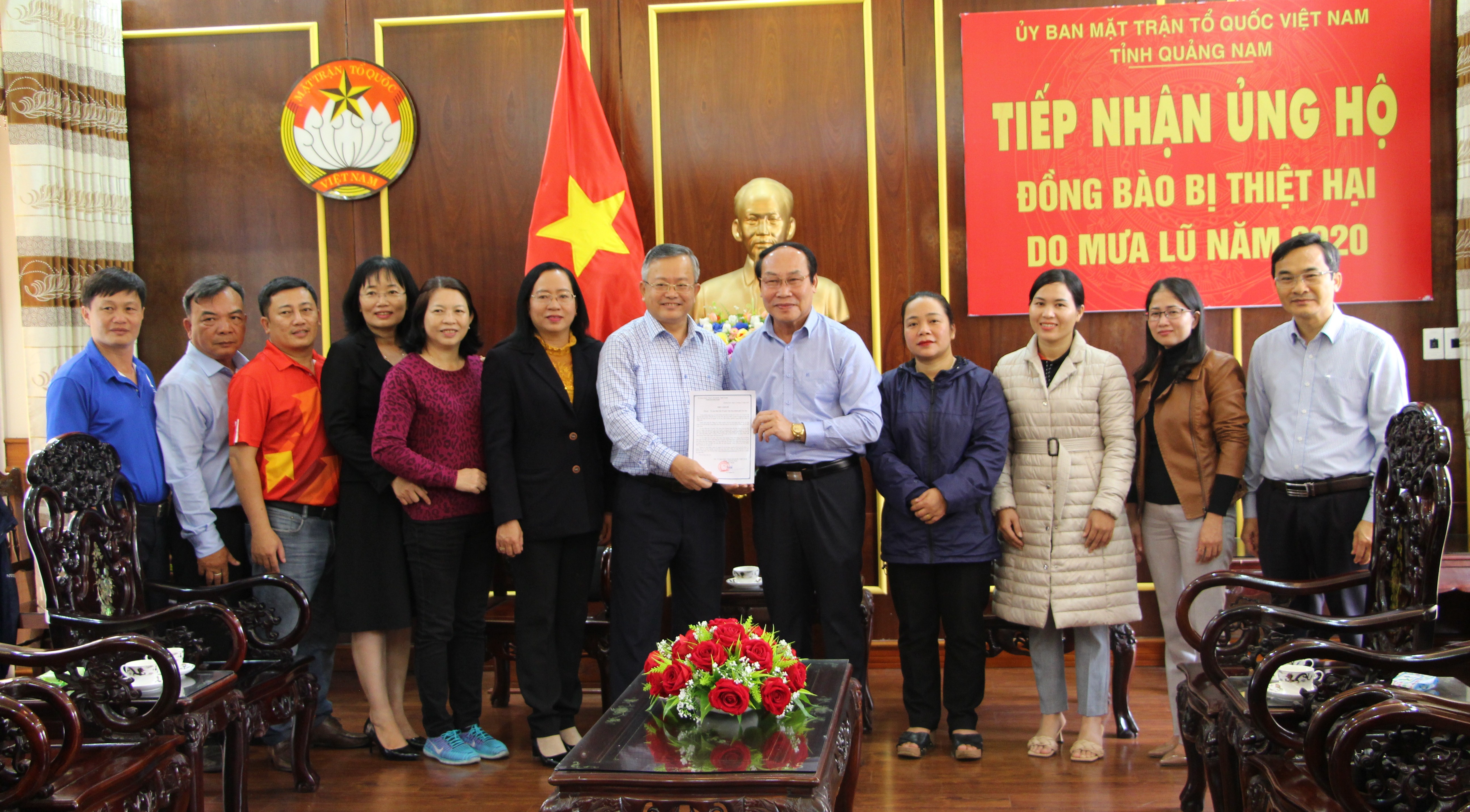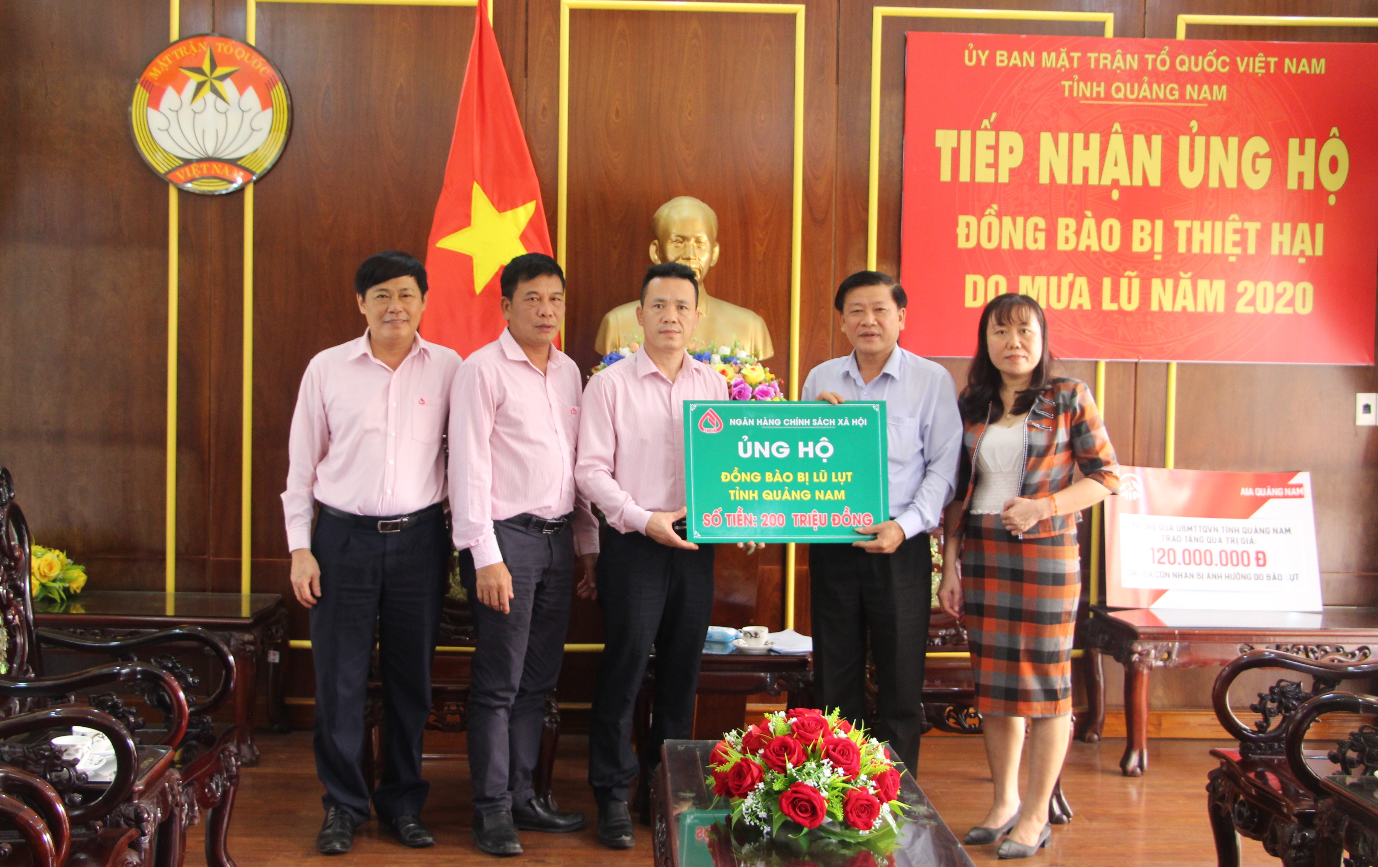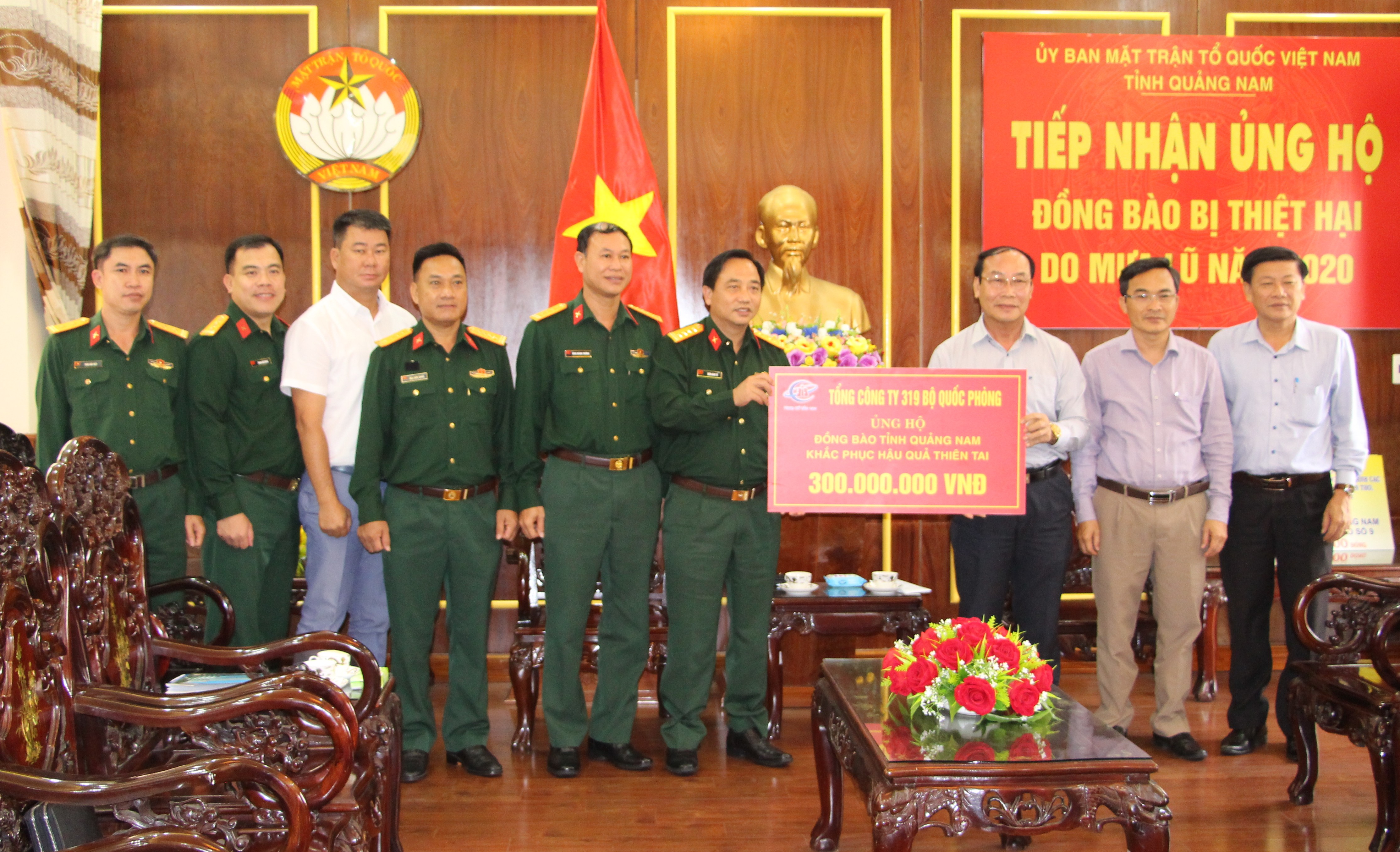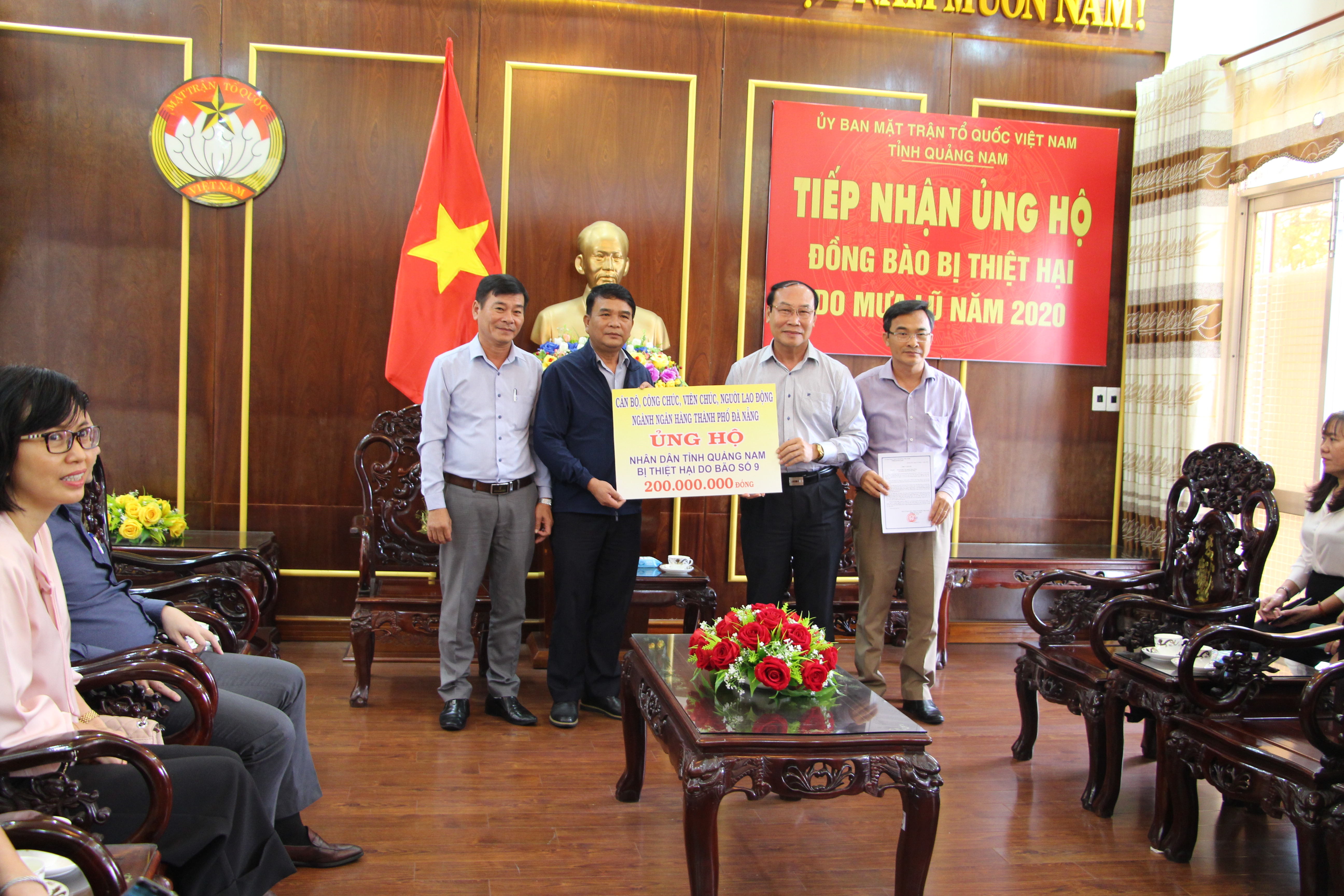 Ngày 4/11/2020, Ban Thường trực Ủy ban MTTQ Việt Nam tỉnh tiếp đón Đoàn cán bộ nhân viên ngành Ngân hàng Nhà nước thành phố Đà Nẵng đến trao số tiền ủng hộ 250 triệu đồng, trong đó có 50 triệu đồng của cụm thi đua số 01 ngành Ngân hàng Nhà nước gửi ủng hộ đồng bào Quảng Nam và Lãnh đạo Tổng Công ty 319 Bộ Quốc phòng đến thăm hỏi, động viên và ủng hộ 300 triệu đồng.