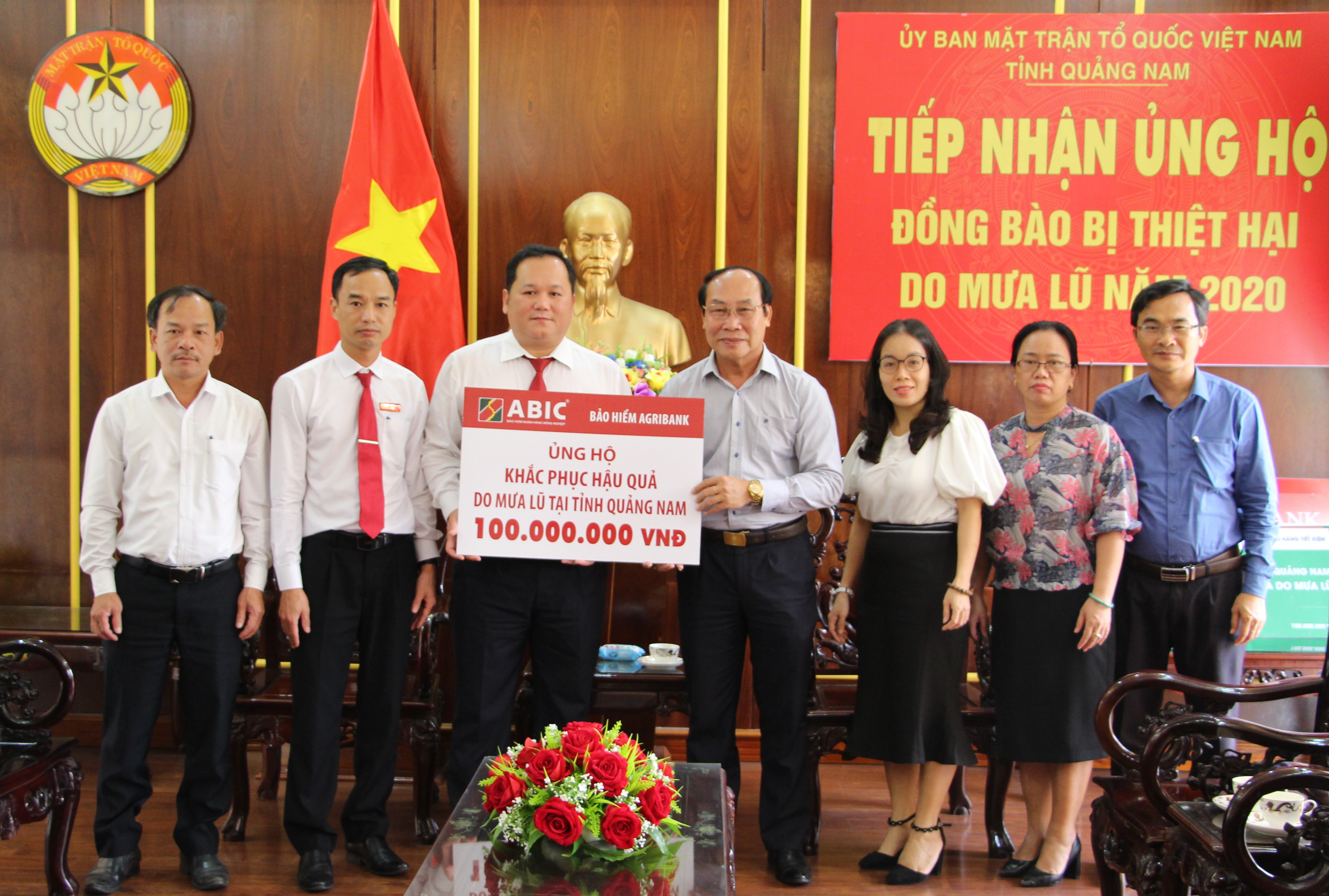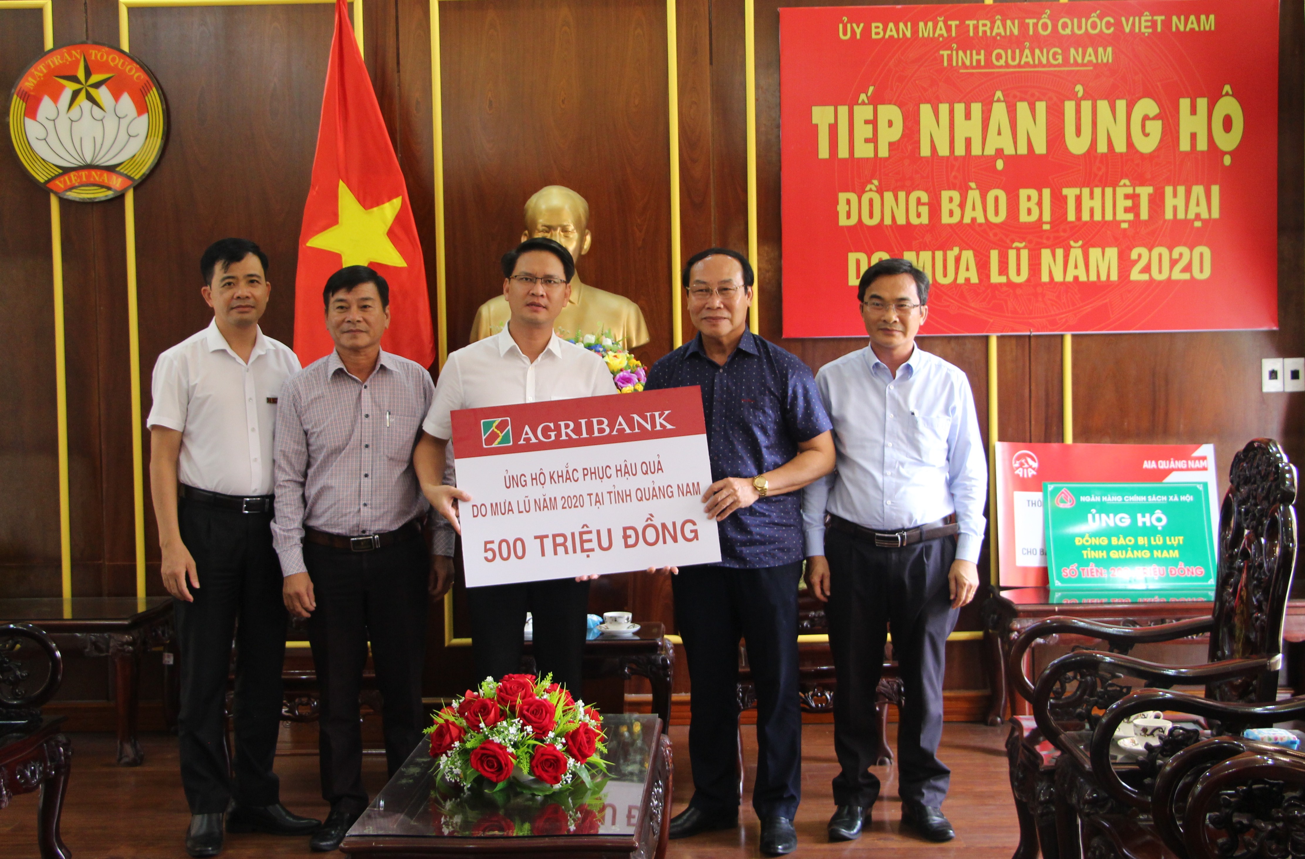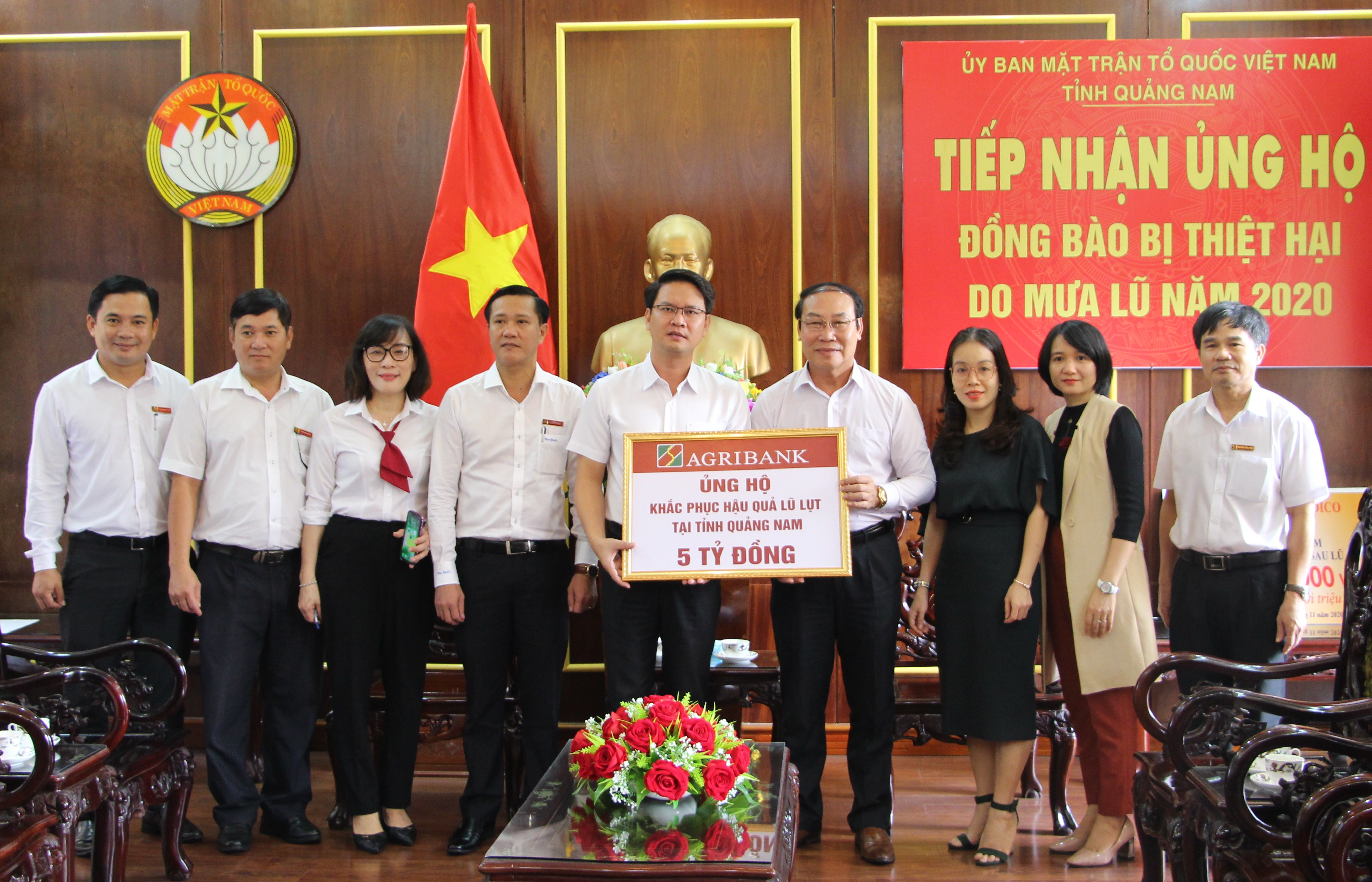Ngày 26/11/2020, Lãnh đạo Ngân hàng Agribank Quảng Nam đại diện cho hệ thống Ngân hàng Agribank Việt Nam thông qua cơ quan Ủy ban MTTQ Việt Nam tỉnh hỗ trợ đồng bào Quảng Nam khắc phục hậu quả bão lụt (đợt 2) với số tiền 05 tỷ đồng. Đợt 1, khi bão lũ đi qua, hiểu được sự khó khăn của đồng bào bị ảnh hưởng Ngân hàng Agribank Việt Nam đã trích ngay số tiền 500 triệu đồng kịp thời hỗ trợ bà con vượt qua khó khăn trước mắt. Nay, Ngân hàng Agribank Việt Nam tiếp tục vận động và hỗ trợ đợt 2 nhằm tiếp sức thêm nguồn lực giúp đồng bào Quảng Nam ổn định cuộc sống. Lãnh đạo Ngân hàng mong muốn thông qua kênh tiếp nhận của Ủy ban MTTQ Việt Nam tỉnh để nguồn hỗ trợ được phân bổ hài hòa, hợp lý, đến được địa chỉ cần giúp đỡ. Ông Võ Xuân Ca- UVBTV, Chủ tịch Ủy ban MTTQ Việt Nam tỉnh ghi nhận và khẳng định: Nguồn vận động qua kênh tiếp nhận của Ủy ban MTTQ Việt Nam tỉnh sẽ có kế hoạch, tập trung hỗ trợ việc khắc phục nhà ở cho người dân bị thiết hại, hỗ trợ sinh kế để tiếp tục sản xuất, ổn định cuộc sống lâu dài cho người dân.