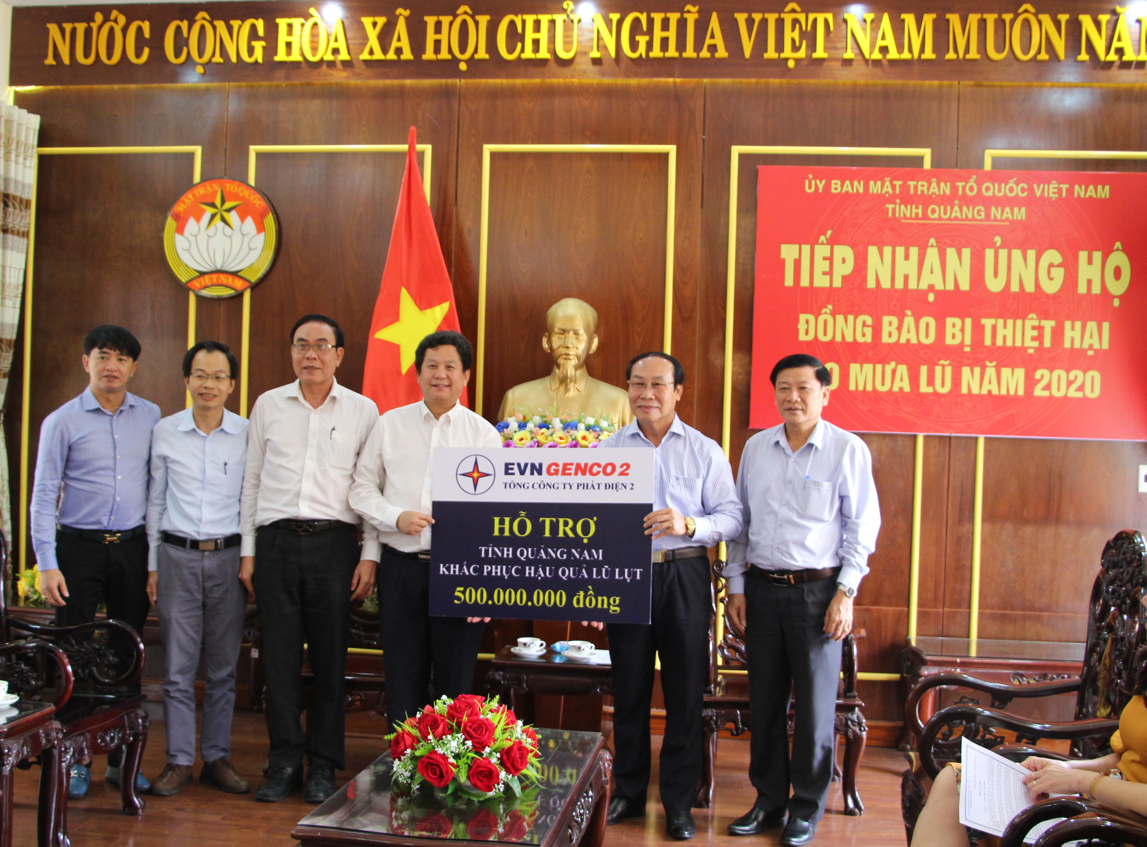 Sáng 23/10, Tổng công ty Phát điện 2 đến trao biển ủng hộ Quảng Nam 500 triệu nhằm góp phần hỗ trợ người dân bị thiệt hại do bão lũ gây ra. Tiếp nhận tiền ủng hộ, ông Võ Xuân Ca-Chủ tịch Ủy ban MTTQ Việt Nam tỉnh ghi nhận tình cảm, trách nhiệm cộng đồng của Lãnh đạo, cán bộ công nhân viên Công ty và ông mong rằng ngành Điện lực cũng như các nhà máy thủy điện trên địa bàn Quảng Nam luôn theo dõi diễn biến thời tiết, có phương án xả nước phù hợp tránh gây thiệt hại về người, tài sản của nhân dân vùng hạ lưu.