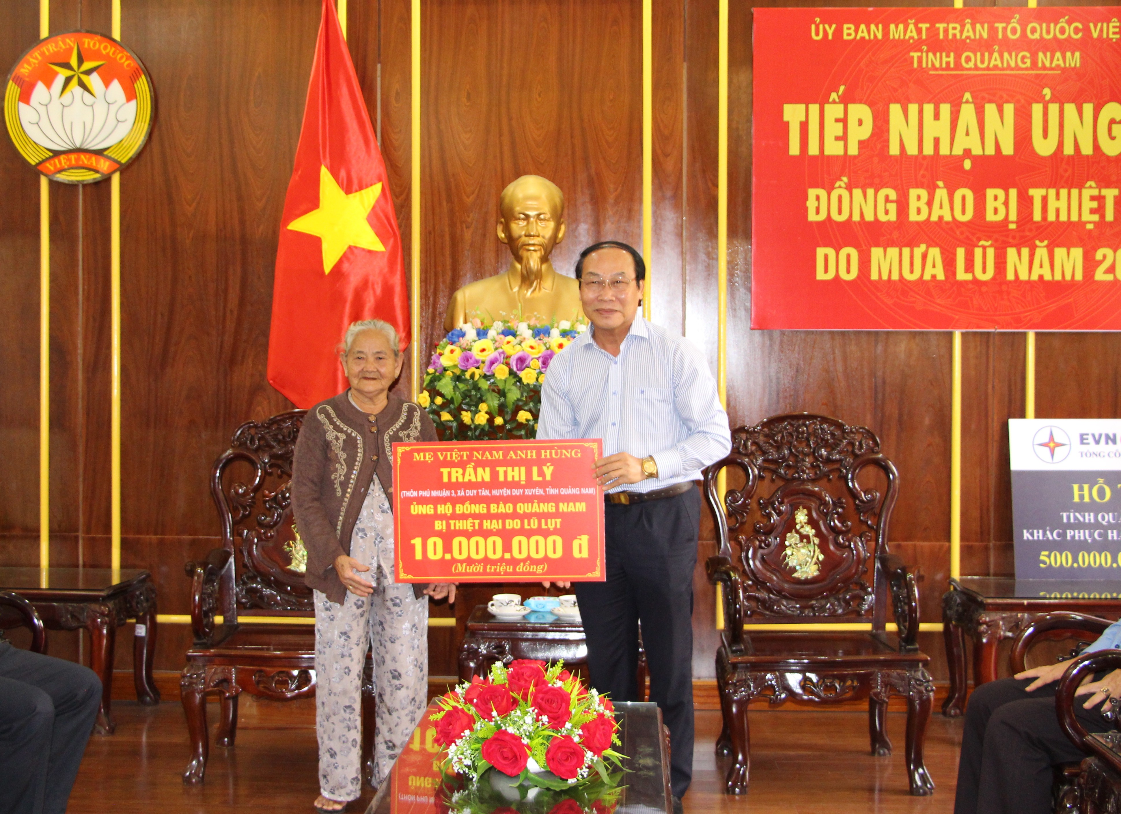 Quảng Nam cũng như các tỉnh miền Trung, hằng năm đều chịu ảnh hưởng bởi sự khắc nghiệt của thiên nhiên. Năm nào Quảng Nam cũng nhận được những tình cảm, sẻ chia của đồng bào cả nước khi xảy ra thiên tai, bão lụt. Tiếp nhận nguồn tiền ủng hộ, ông Võ Xuân Ca- Chủ tịch Ủy ban MTTQ Việt Nam tỉnh ghi nhận tình cảm của đồng bào cả nước nói chung, của cán bộ công nhân viên Công ty Điện lực miền Trung nói riêng. Ông khẳng định: Từ những nguồn tiền xã hội đóng góp, Ủy ban MTTQ Việt Nam tỉnh sẽ tham mưu đề xuất tập trung hỗ trợ khắc phục nhà ở, đời sống cho bà con bị ảnh hưởng, thăm hỏi, hỗ trợ các gia đình bị nạn tạo điều kiện để bà con vượt qua giai đoạn khó khăn và ổn định cuộc sống.
