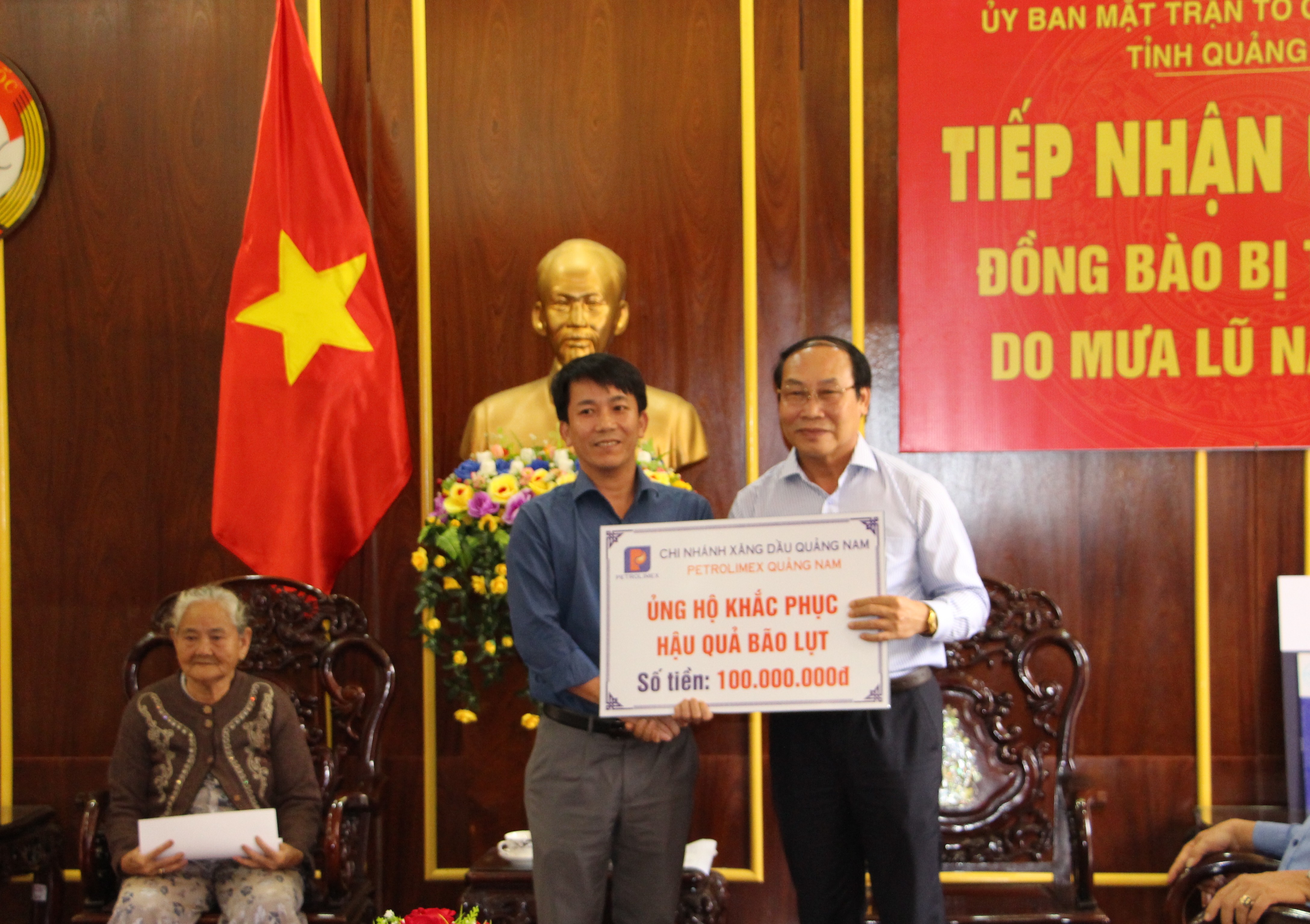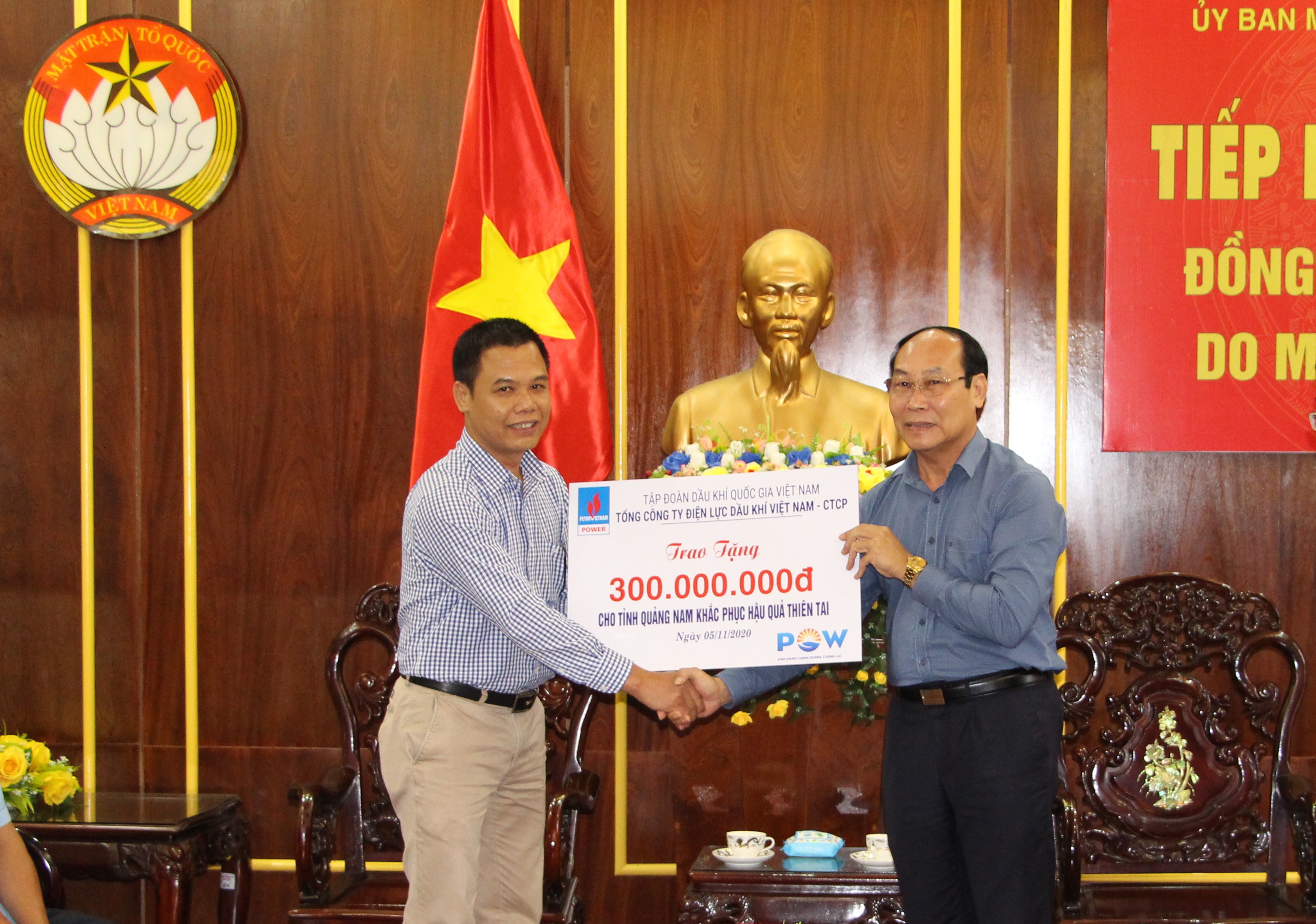 Ngày 5/11/2020, ông Võ Xuân ca- Chủ tịch Ủy ban MTTQ Việt Nam tỉnh tiếp đón Lãnh đạo Tổng công ty Điện lực Dầu khí Việt Nam đến thăm và trao tặng 300 triệu đồng, thông qua Ủy ban MTTQ Việt Nam tỉnh lãnh đạo, CBCNV công ty gửi gắm tình cảm đến đồng bào vùng bị thiệt hại, với chút tình cảm ấm áp này sẽ là nguồn động lực để nhân dân vượt qua khó khăn nhanh chóng ổn định cuộc sống. Ông Võ Xuân Ca trân trọng trao thư cảm ơn tình cảm của toàn thể lãnh đạo, CBCNV Công ty dành cho đồng bào Quảng Nam.