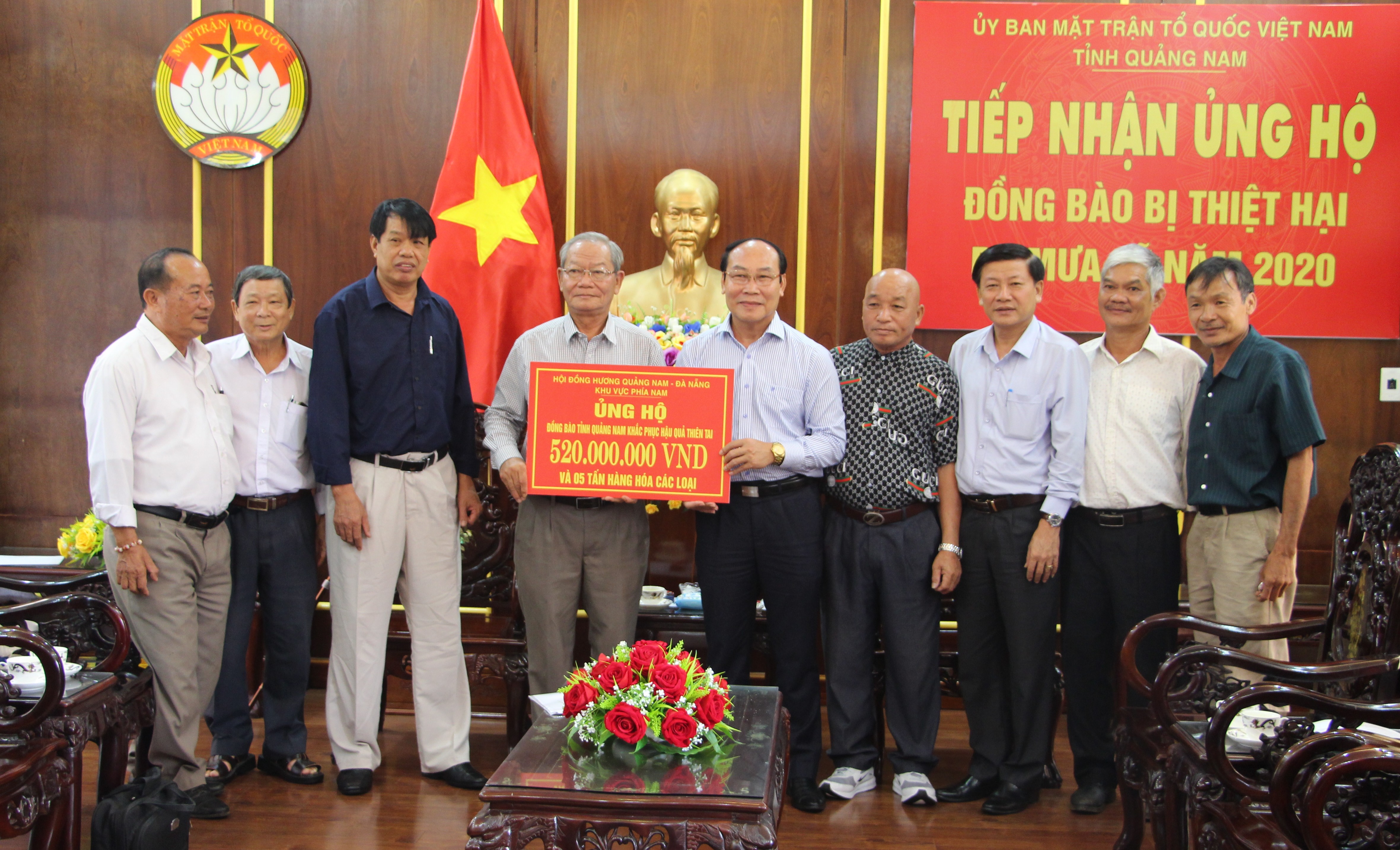 Ngày 10/11/2020, ông Trần Công Cảnh- Phó Chủ tịch Hội đồng hương Quảng Nam- Đà Nẵng khu vực phía Nam cùng đoàn về thăm quê hương và ủng hộ đồng bào Quảng Nam bị thiệt hại bão lụt số tiền 520 triệu đồng và 05 tấn hàng hàng các loại. Ông Võ Xuân Ca- UVBTV Tỉnh ủy, Chủ tịch Ủy ban MTTQ Việt Nam tỉnh và các ông bà trong Ban Thường trực Ủy ban MTTQ Việt Nam tỉnh đón tiếp.