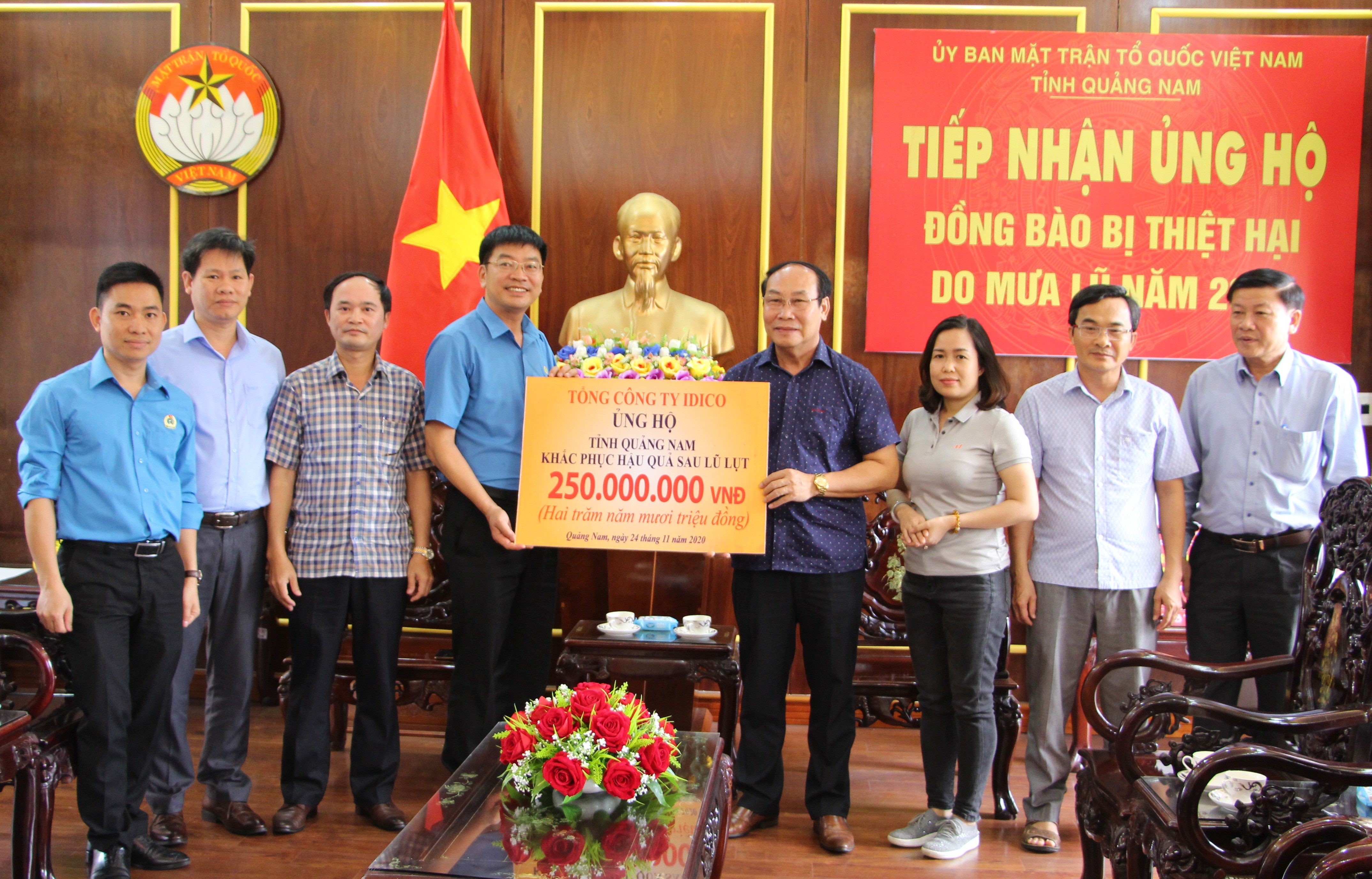 Ngày 24/11/2020, Lãnh đạo, Công đoàn Tổng công ty IDICO đến thăm hỏi và ủng hộ đồng bào Quảng Nam khắc phục bão lụt số tiền 250 triệu đồng. Ông Võ Xuân Ca- UVBTV, Chủ tịch Ủy ban MTTQ Việt Nam tỉnh tiếp đoàn.