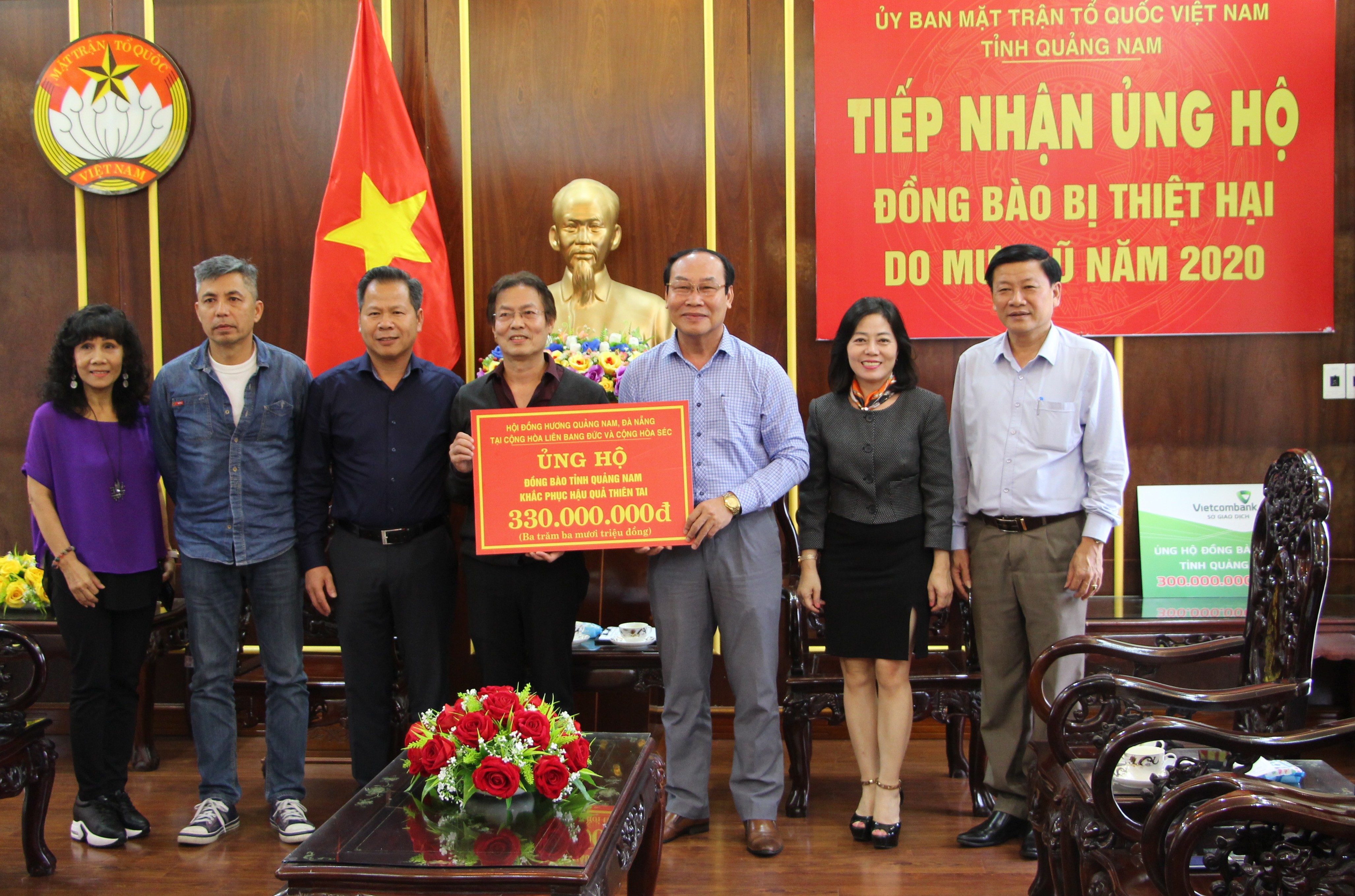 Mặc dù, năm 2020 tình hình dịch bệnh Covid-19 đã ảnh hưởng rất lớn đến đời sống đồng bào ta ở nước ngoài nhưng với tinh thần dân tộc, luôn hướng về quê hương, đồng bào Quảng Nam- Đà Nẵng sinh sống ở Cộng hòa Liên bang Đức và Cộng hòa Séc quyên góp, ủng hộ góp phần giúp đỡ đồng bào Quảng Nam khắc phục thiên tai, bão lũ. Nguyện vọng của Đoàn sẽ trực tiếp đến trao số tiền 220 triệu cho đồng bào các xã Phước Thành, Phước Lộc, huyện Phước Sơn và 110 triệu sẽ thông qua Ủy ban MTTQ Việt Nam tỉnh và BHXH tỉnh trao 137 thẻ BHYT cho những người có hoàn cảnh khó khăn bị ảnh hưởng bão lụt tại xã Bình Triều, huyện Thăng Bình.