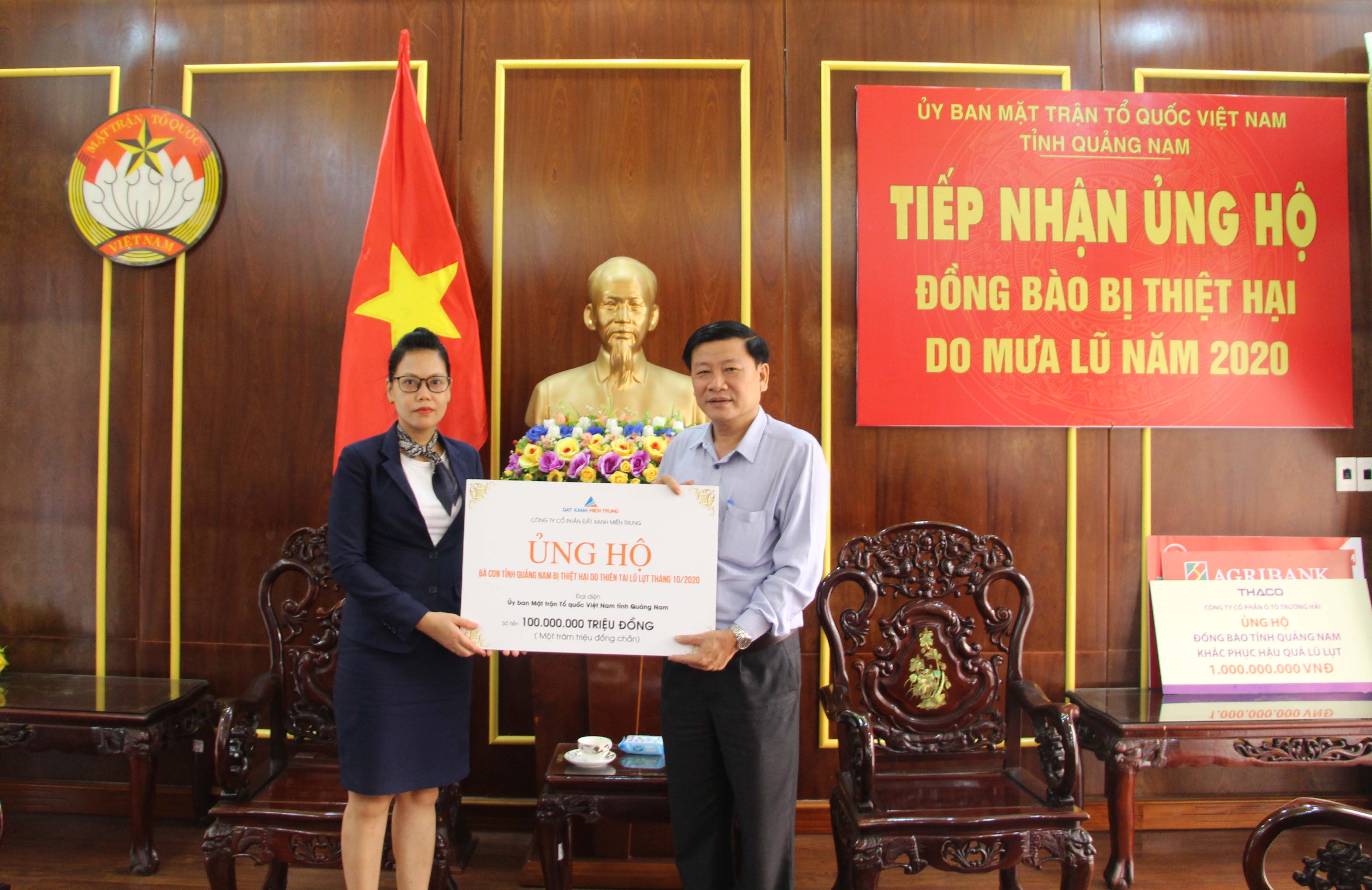 Bà Nguyễn Thị Ái Phương - Trưởng phòng Hành chính - Nhân sự Công ty Cổ phần Đất xanh Miền Trung trao ủng hộ 100 triệu đồng
