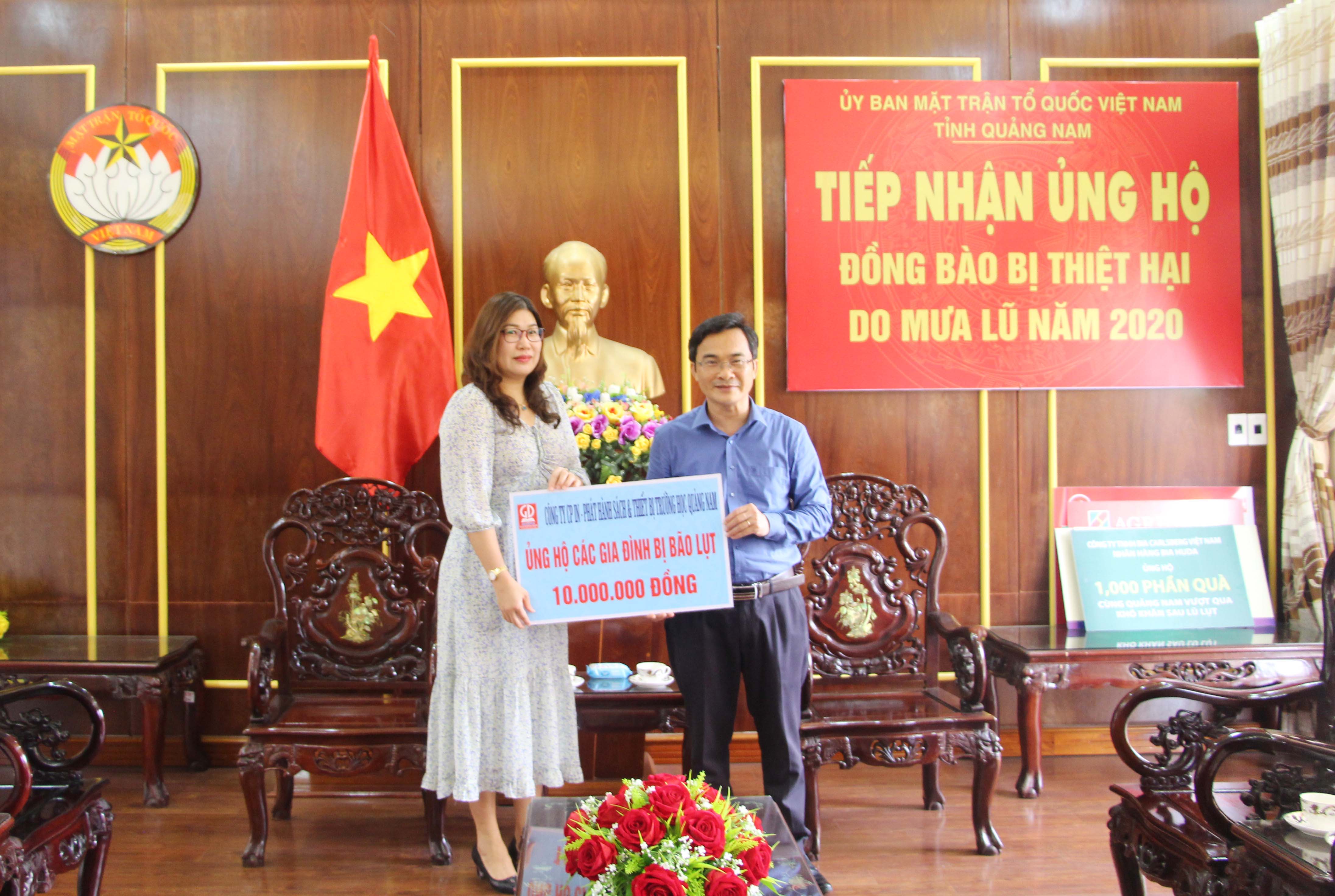 Ông Nguyễn Phi Hùng - Phó Chủ tịch TT Ủy ban MTTQ Việt Nam tỉnh tiếp nhận ủng hộ của Công ty In - Phát hành sách & Thiết bị Trường học Quảng Nam
