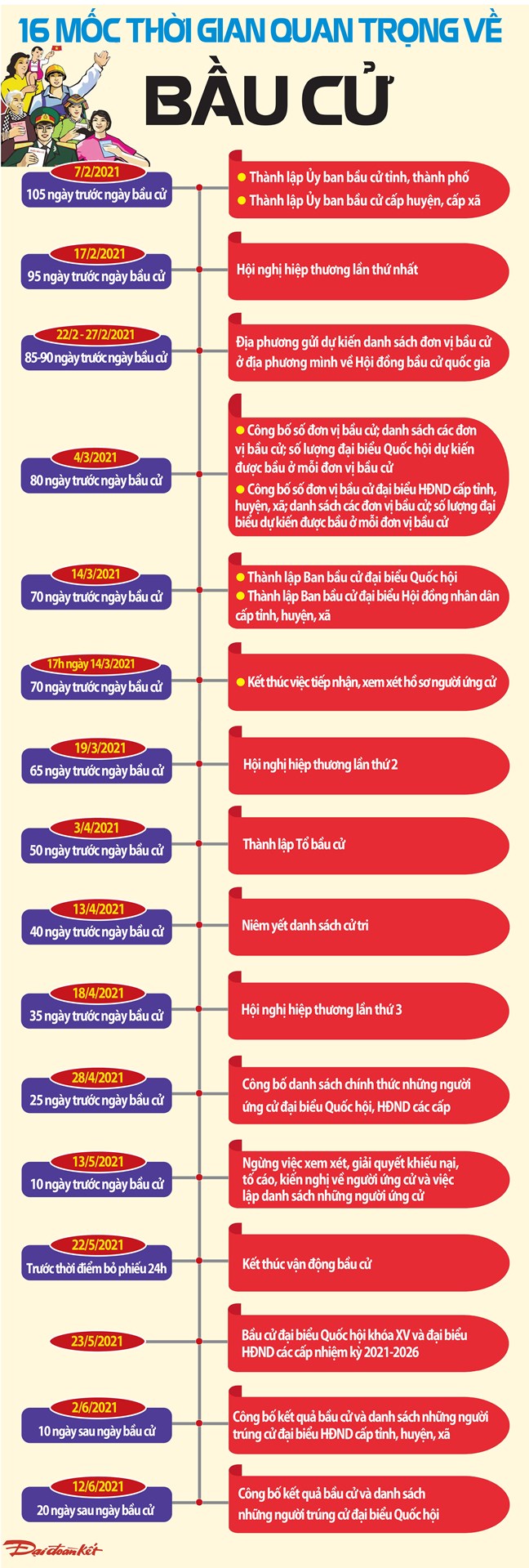 Để triển khai công tác bầu cử đại biểu Quốc hội khóa XV và bầu cử đại biểu Hội đồng nhân dân các cấp nhiệm kỳ 2021 - 2026, Hội đồng bầu cử Quốc gia đã ban hành Kế hoạch 42/KH-HĐBCQG. Kế hoạch này đã nêu rõ 16 mốc thời gian quan trọng trong kỳ bầu cử này.