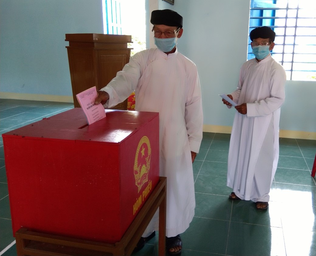 Cử tri họ đạo Cao đài tham gia bầu cử tại điểm bỏ phiếu số 03, thôn Đông Tác xã Bình Nam (Thăng Bình)