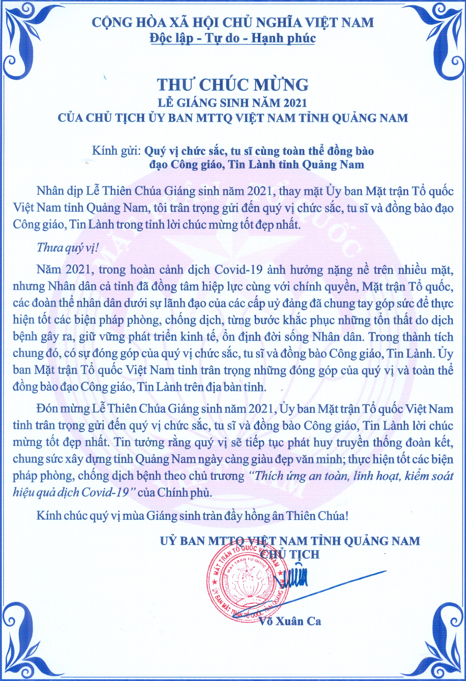 Thư chúc mừng Lễ Giáng sinh năm 2021 của Chủ tịch Ủy ban MTTQ Việt Nam tỉnh Quảng Nam