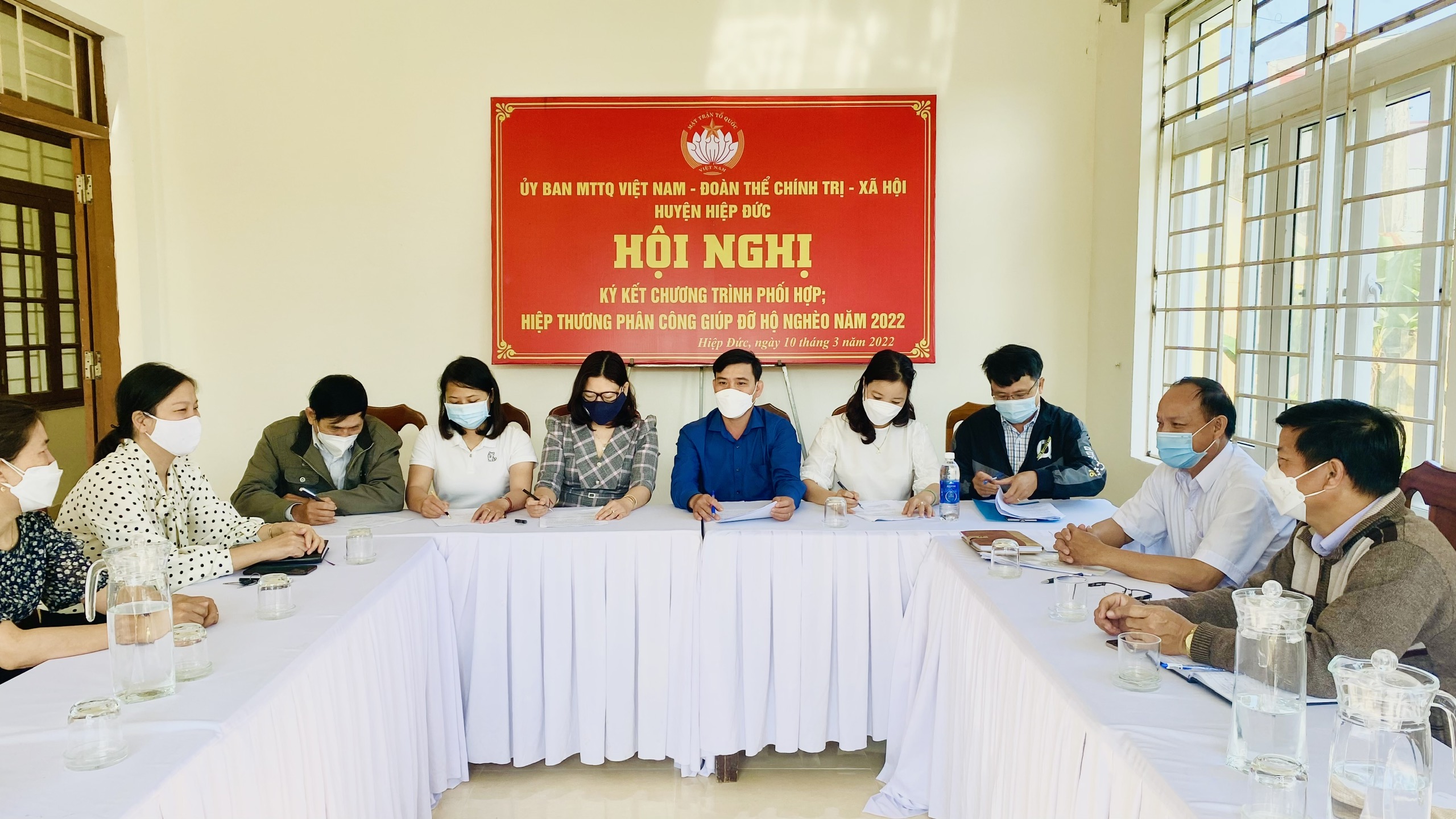 Tại hội nghị đã hiệp thương phân công mỗi đoàn thể chính trị - xã hội nhận giúp đỡ ít nhất 02 hộ nghèo để thoát nghèo bền vững trong năm 2022; đồng thời phân công mỗi đoàn thể nhận giúp đỡ 01 hộ là đối tượng chính sách được hỗ trợ xây dựng mới nhà ở trong dịp chào mừng kỷ niệm 50 năm Ngày giải phóng Hiệp Đức.