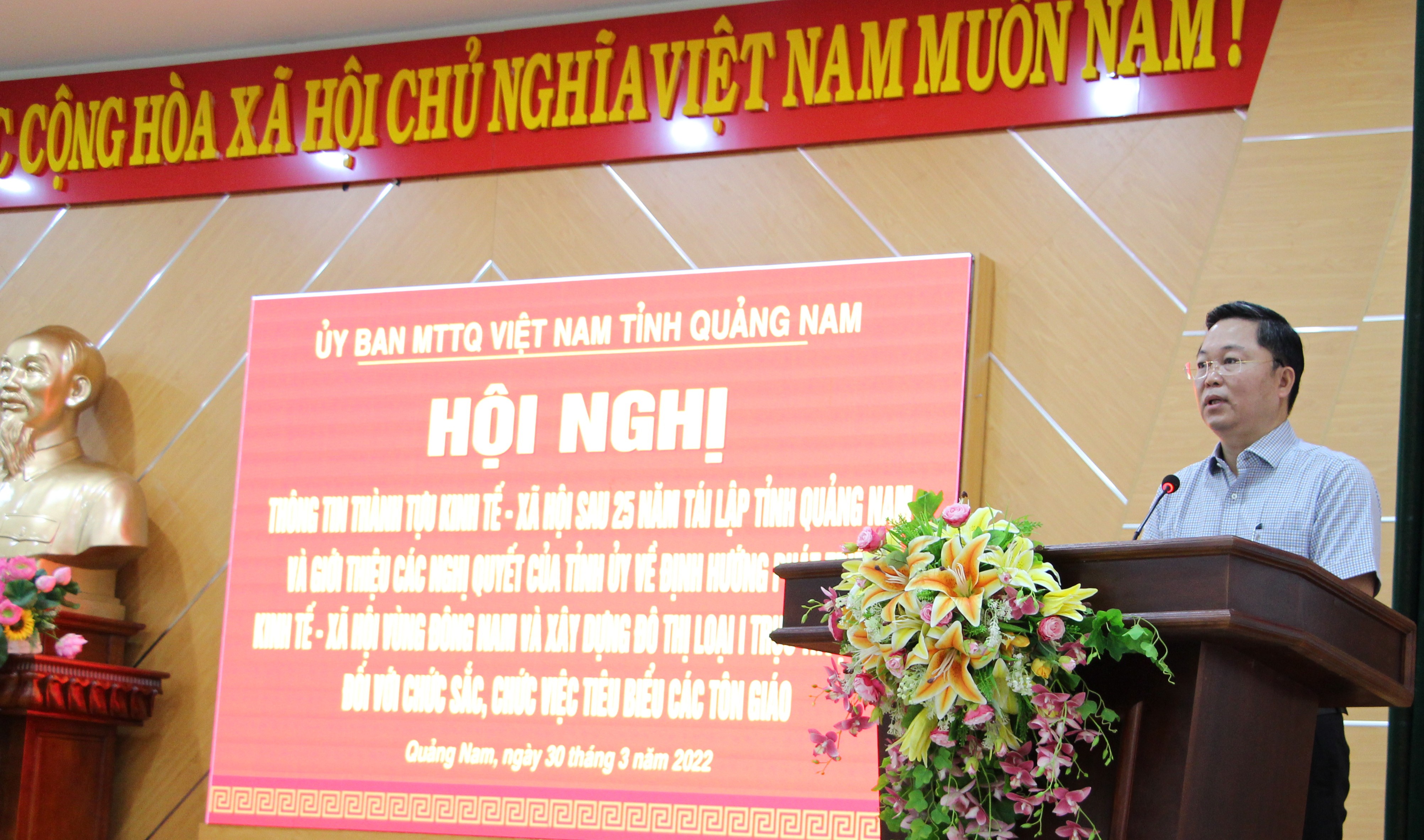 Ban Thường trực Ủy ban MTTQ Việt Nam tỉnh mời ông Lê Trí Thanh- Phó Bí thư Tỉnh ủy, Chủ tịch UBND tỉnh tham dự và thông tin đến các đại biểu về tình hình kinh tế- xã hội tỉnh Quảng Nam 25 năm tái lập tỉnh; giới thiệu các nội dung cơ bản của Nghị quyết số 07-NQ/TU ngày 04/5/2021 của Tỉnh ủy về định hướng phát triển vùng Đông Nam của tỉnh đến năm 2025, tầm nhìn đến năm 2030. Mời ông Trần Nam Hưng- UVBTV Tỉnh ủy, Bí thư Thành ủy Tam Kỳ tham dự và giới thiệu Nghị quyết số 08-NQ/TU ngày 04/5/2021 của Tỉnh ủy về xây dựng và phát triển đô thị loại I trực thuộc tỉnh Quảng Nam.