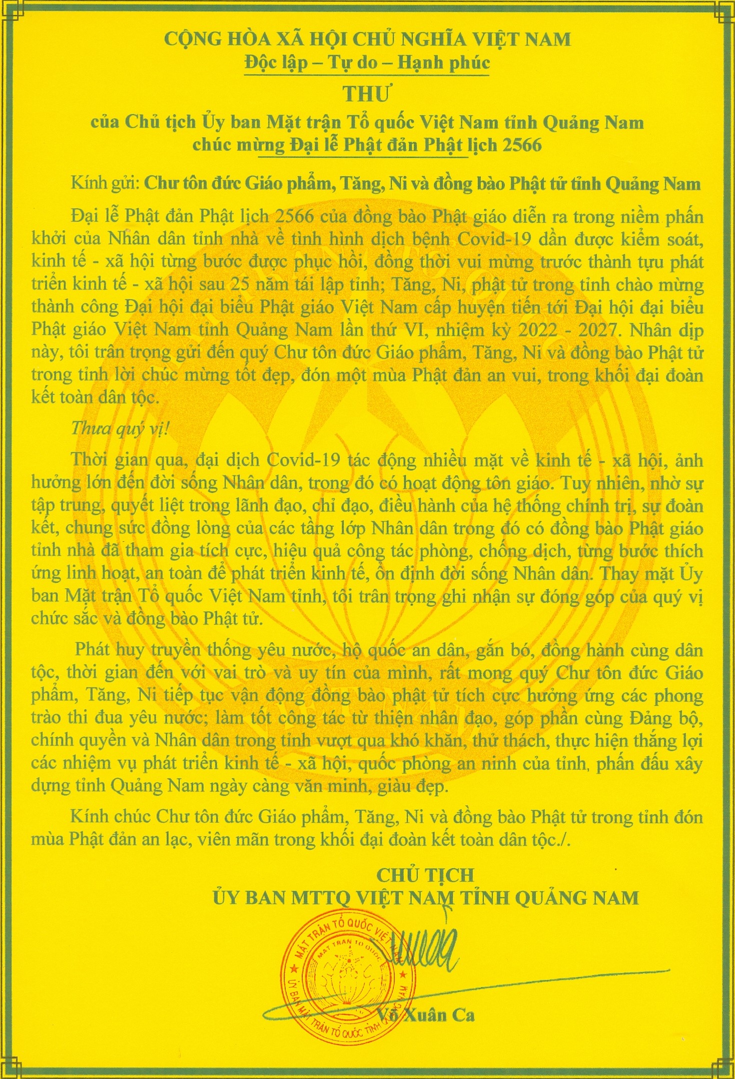 Thư chúc mừng Đại lễ Phật đản Phật lịch 2566 của Chủ tịch Ủy ban MTTQ Việt Nam tỉnh Quảng Nam