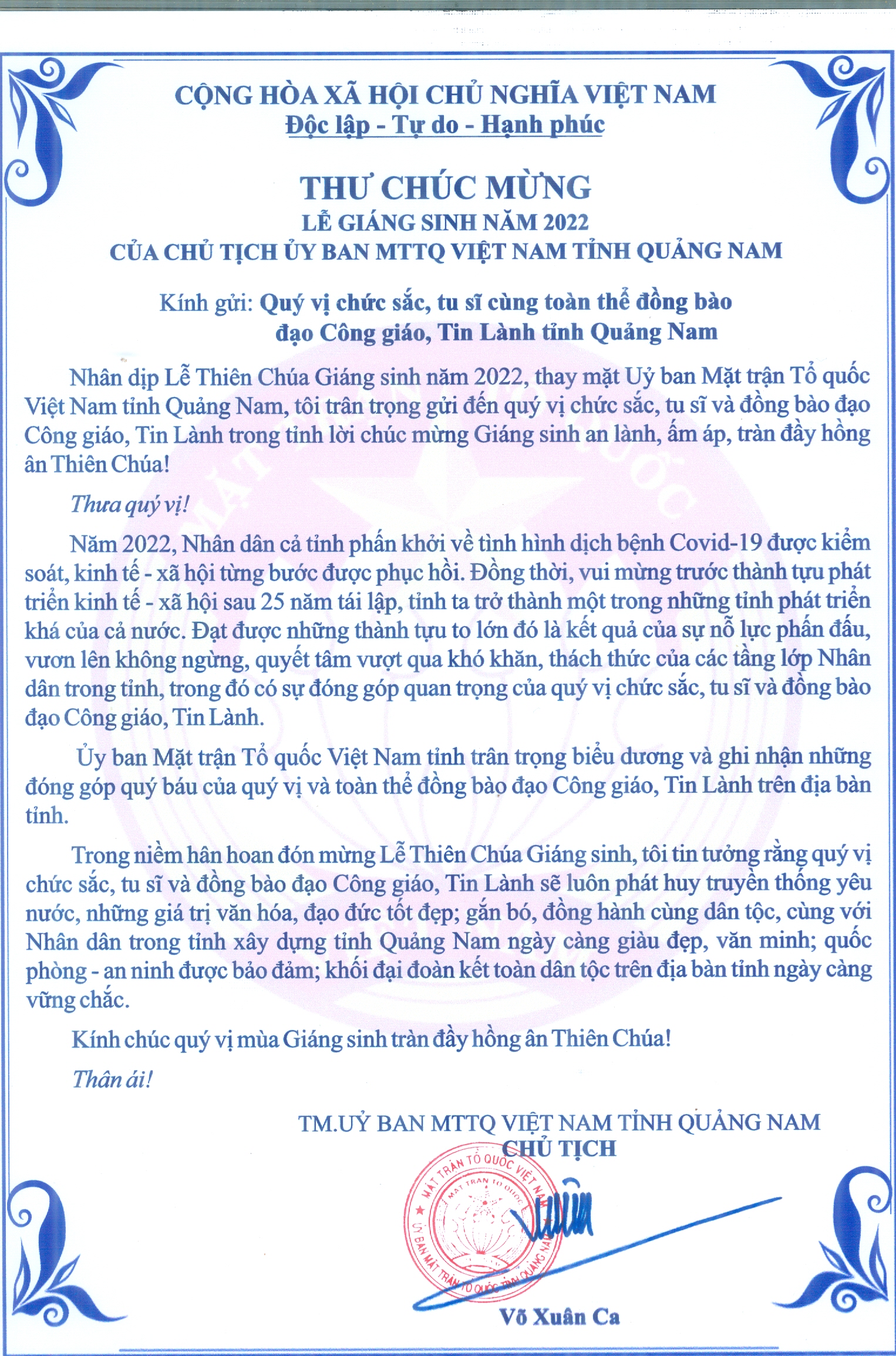 Thư chúc mừng Lễ Giáng sinh năm 2022 của Chủ tịch Ủy ban MTTQ Việt Nam tỉnh