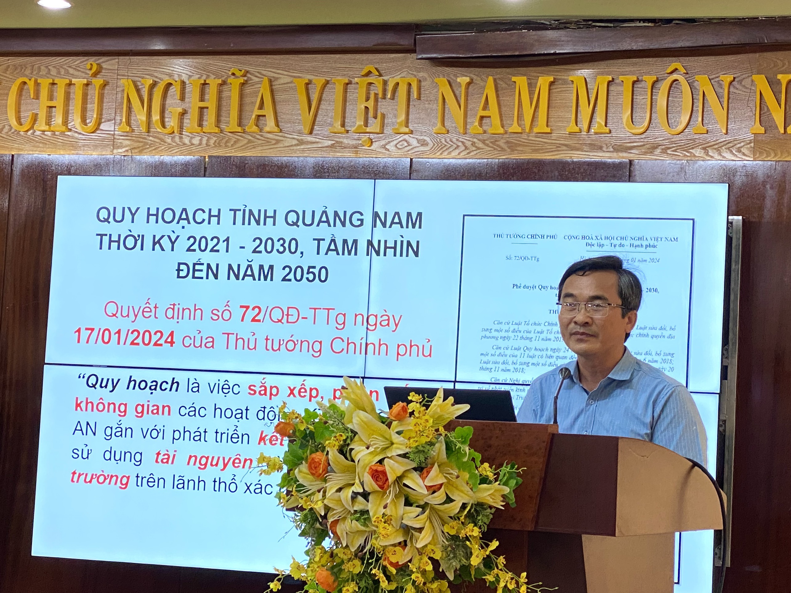 Đồng chí nhấn mạnh: Quy hoạch tỉnh Quảng Nam thời kỳ 2021 - 2030, tầm nhìn đến năm 2050 (được Thủ tướng Chính phủ phê duyệt tại Quyết định số 72/QĐ-TTg ngày 17/01/2024) là văn kiện có ý nghĩa hết sức quan trọng, là nền tảng pháp lý cho sự phát triển của tỉnh Quảng Nam; là cơ sở để điều hành và quản lý các hoạt động kinh tế - xã hội, quốc phòng-an ninh, phát triển không gian lãnh thổ trên địa bàn tỉnh Quảng Nam với mục tiêu: Xây dựng Quảng Nam trở thành tỉnh phát triển khá của cả nước vào năm 2030 và trở thành thành phố trực thuộc trung ương, có đóng góp lớn cho ngân sách Trung ương vào năm 2050.