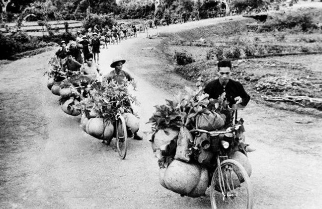 Dân công hỏa tuyến vận chuyển hàng hóa trong Chiến dịch Điện Biên Phủ. Ảnh tư liệu