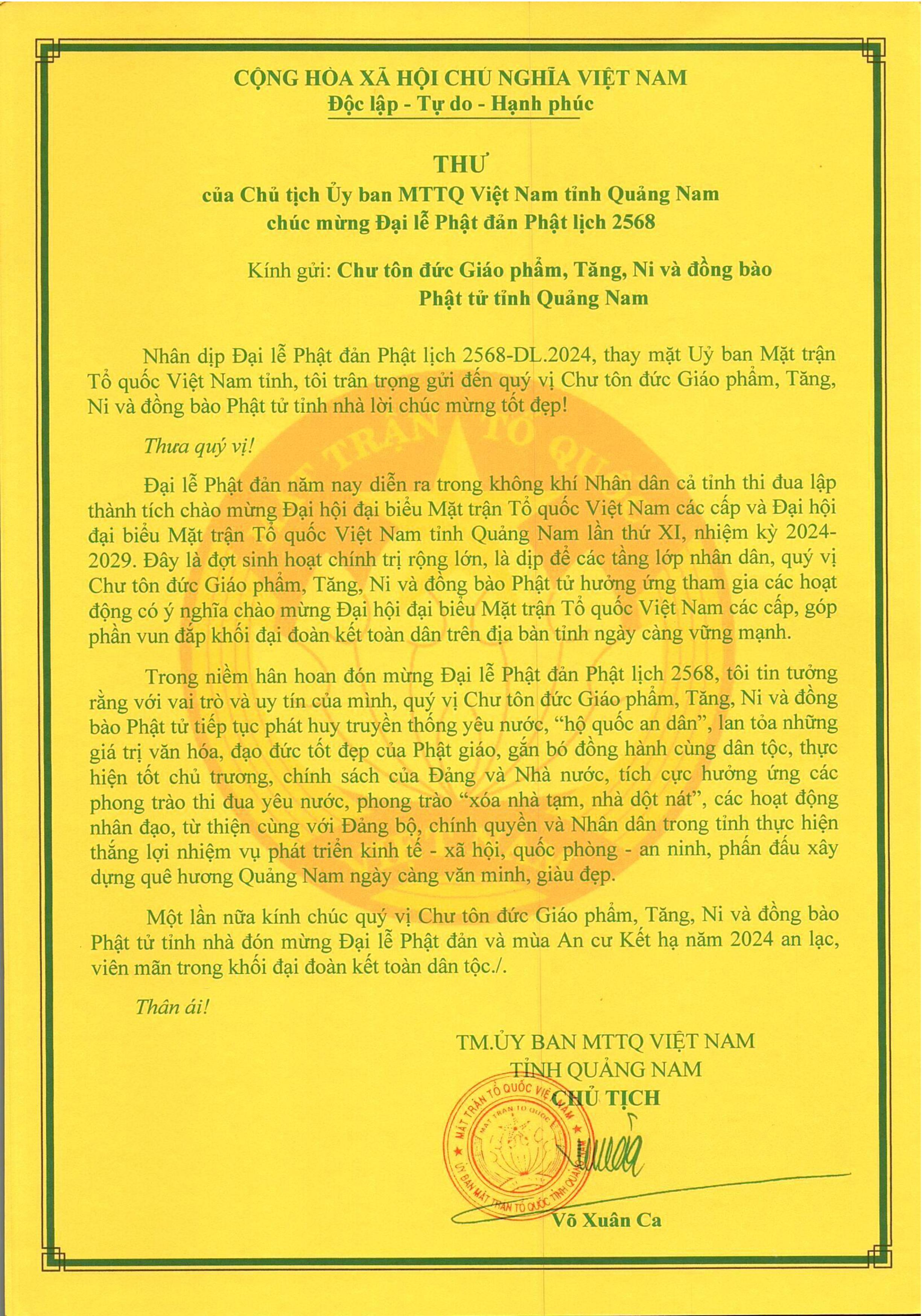 Thư của Chủ tịch Ủy ban MTTQ Việt Nam tỉnh Quảng Nam chúc mừng Đại lễ Phật đản Phật lịch 2568