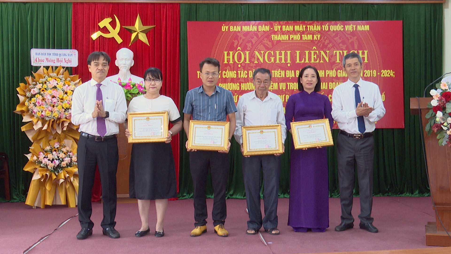Ông Nguyễn Duy Ân, Phó Bí thư Thành ủy- Chủ tịch UBND thành phố và ông Nguyễn Ba, UVBTV Thành ủy- Chủ tịch Ủy ban MTTQ Việt Nam thành phố bằng khen cho các tập thể và cá nhân có thành tích xuất sắc trong công tác dân tộc nhiệm kỳ 2019 - 2024