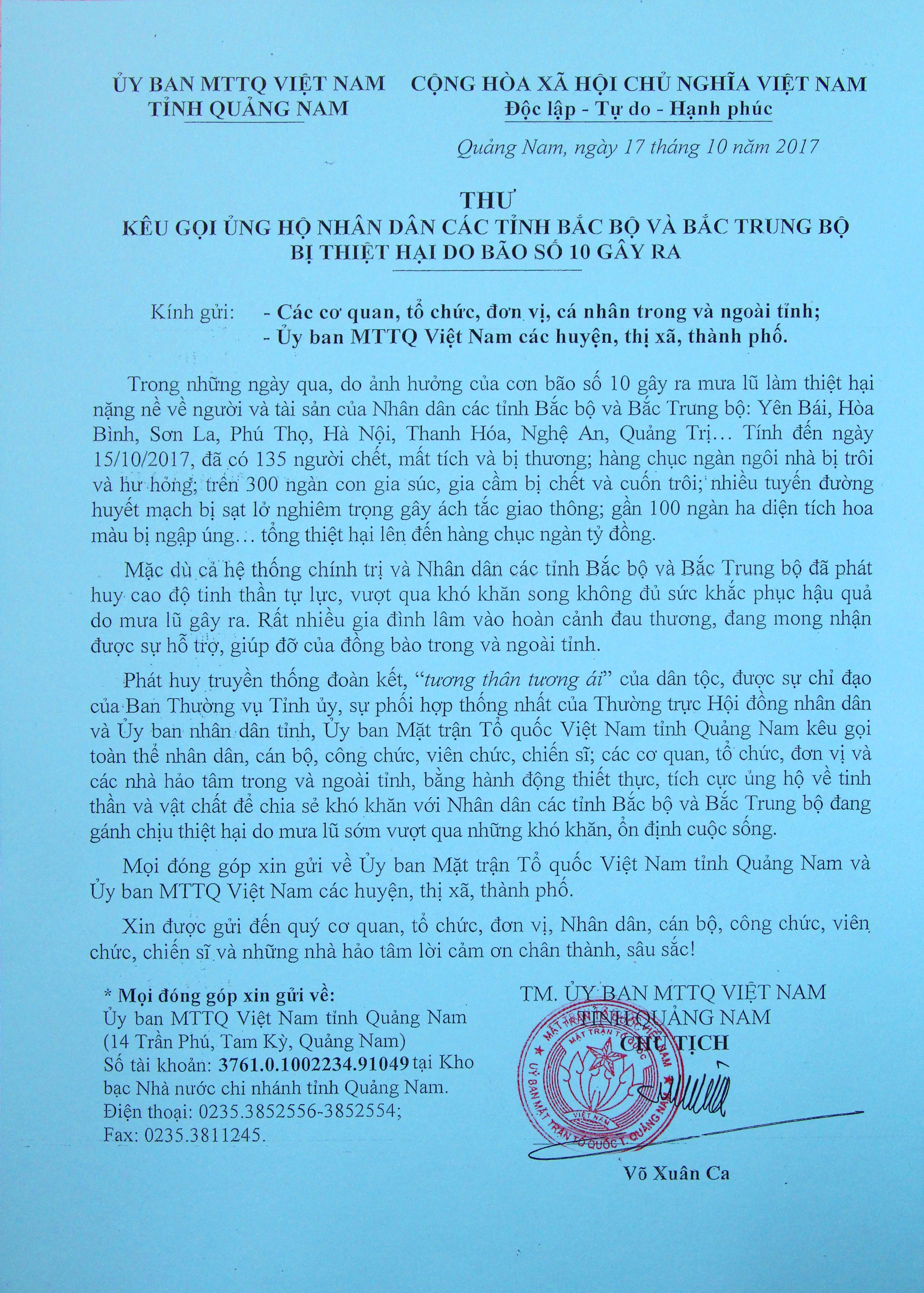 Cơn bão số 10 vừa qua đã gây thiệt hại nặng nề về người và tài sản của Nhân dân các tỉnh Bắc bộ và Bắc Trung bộ. Phát huy truyền thống đoàn kết, “tương thân tương ái” của dân tộc, được sự chỉ đạo của Ban Thường vụ Tỉnh ủy, sự phối hợp thống nhất của Thường trực Hội đồng nhân dân và Ủy ban nhân dân tỉnh, Ủy ban Mặt trận Tổ quốc Việt Nam tỉnh Quảng Nam có Thư kêu gọi toàn thể nhân dân, cán bộ, công chức, viên chức, chiến sĩ; các cơ quan, tổ chức, đơn vị và các nhà hảo tâm trong và ngoài tỉnh, bằng hành động thiết thực, tích cực ủng hộ về tinh thần và vật chất để chia sẻ khó khăn với Nhân dân các tỉnh Bắc bộ và Bắc Trung bộ đang gánh chịu thiệt hại do mưa lũ sớm vượt qua những khó khăn, ổn định cuộc sống.