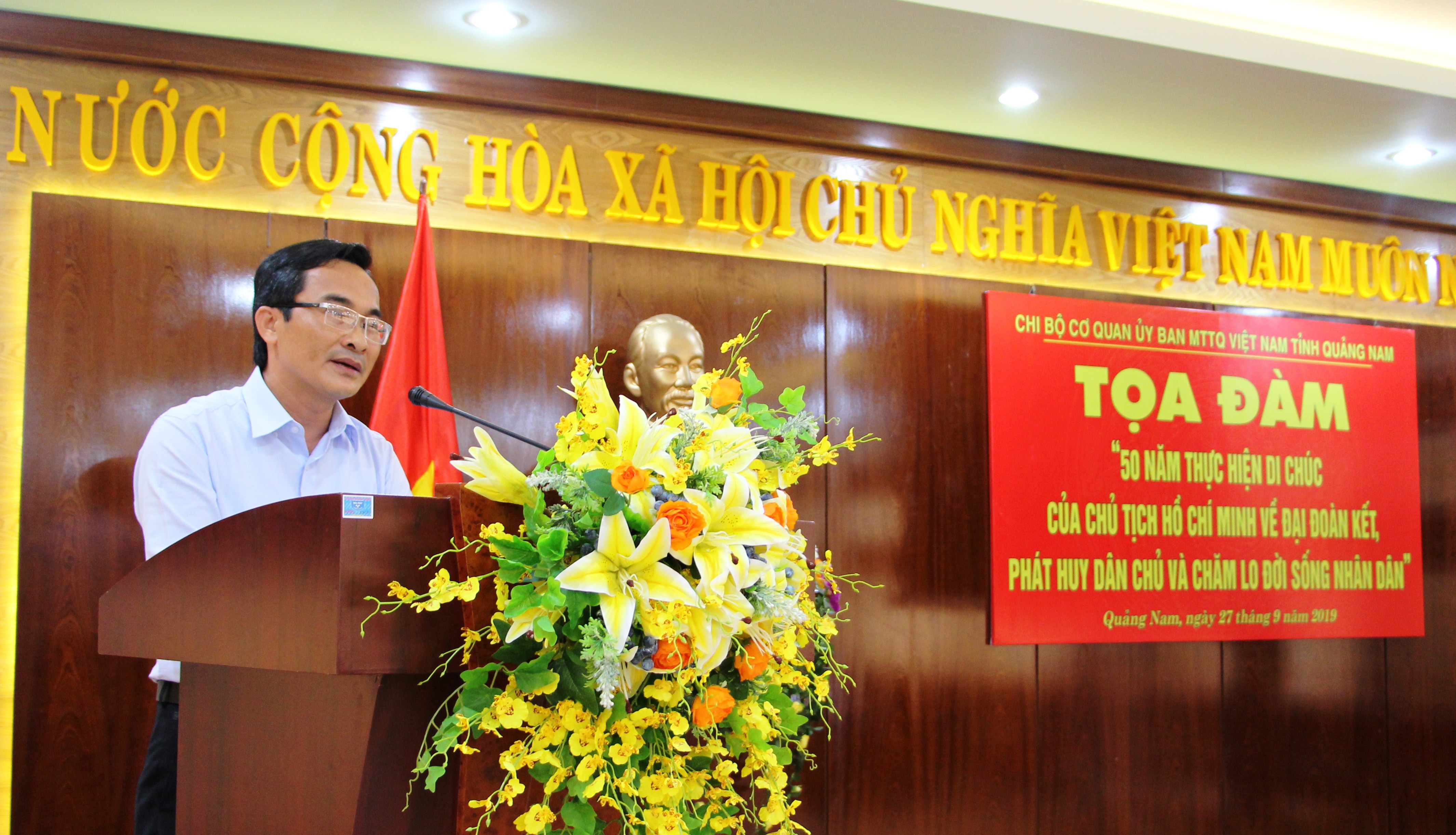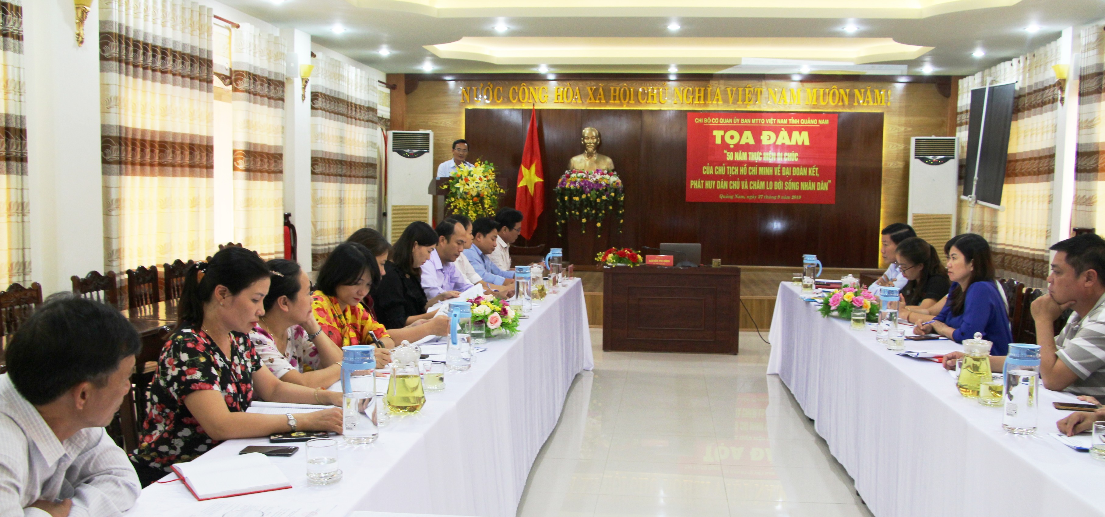 Tham dự Tọa đàm có đồng chí Đỗ Văn Bình- Phó Trưởng phòng Tuyên truyền- Báo chí- Xuất bản, Ban Tuyên giáo Tỉnh ủy, đồng chí Nguyễn Thị Thủy- Phó Chủ tịch Công đoàn viên chức tỉnh, đồng chí Nguyễn Trọng Lĩnh- Phó Ban Tuyên giáo Đảng ủy khối các cơ quan và toàn thể cán bộ đảng viên, đoàn viên cơ quan Ủy ban MTTQ Việt Nam tỉnh. Đồng chí Nguyễn Phi Hùng- Bí thư Chi bộ, Phó Chủ tịch Ủy ban MTTQ Việt Nam tỉnh chủ trì Tọa đàm