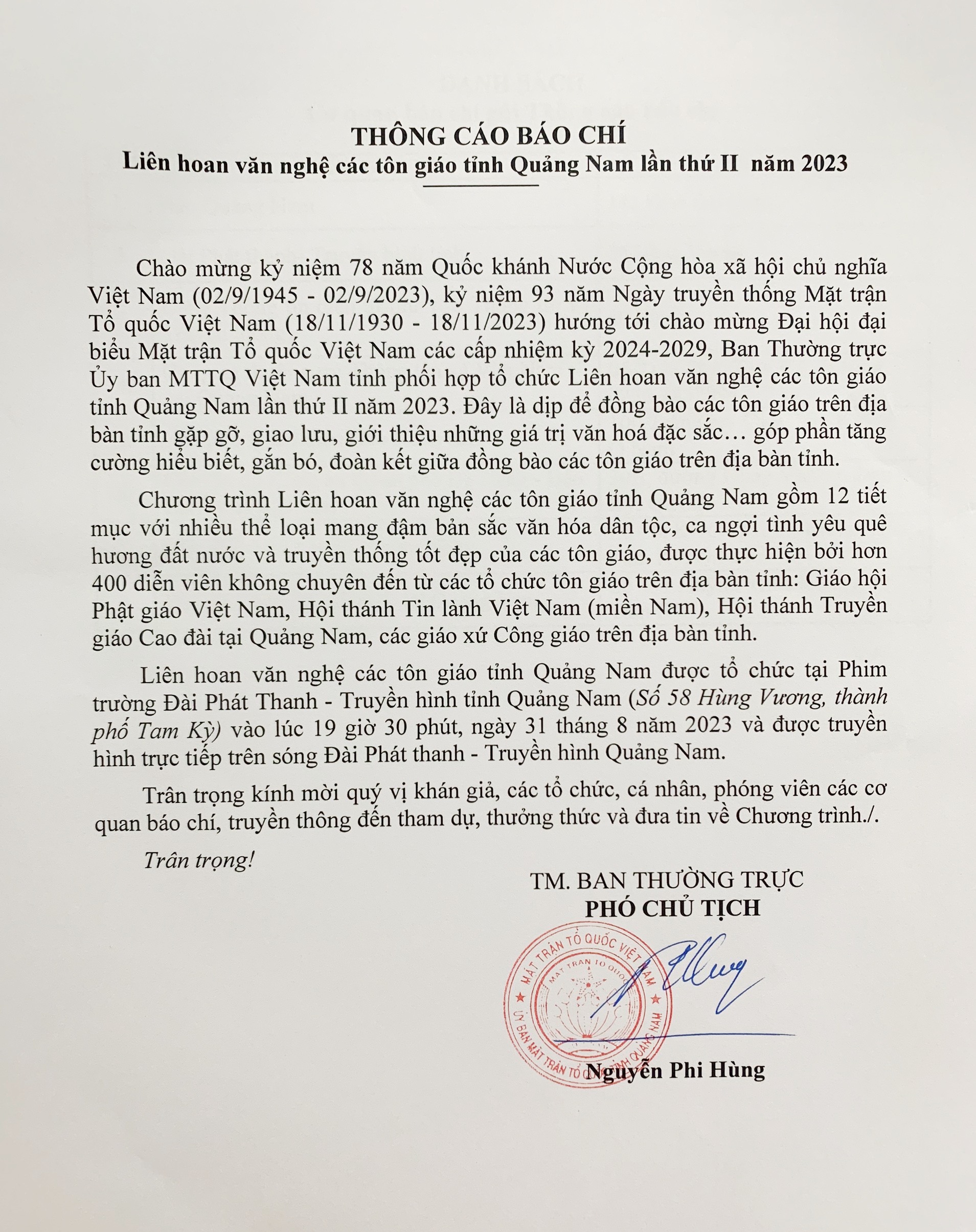 THÔNG CÁO BÁO CHÍ LIÊN HOAN VĂN NGHỆ CÁC TÔN GIÁO TỈNH QUẢNG NAM LẦN THỨ II- NĂM 2023