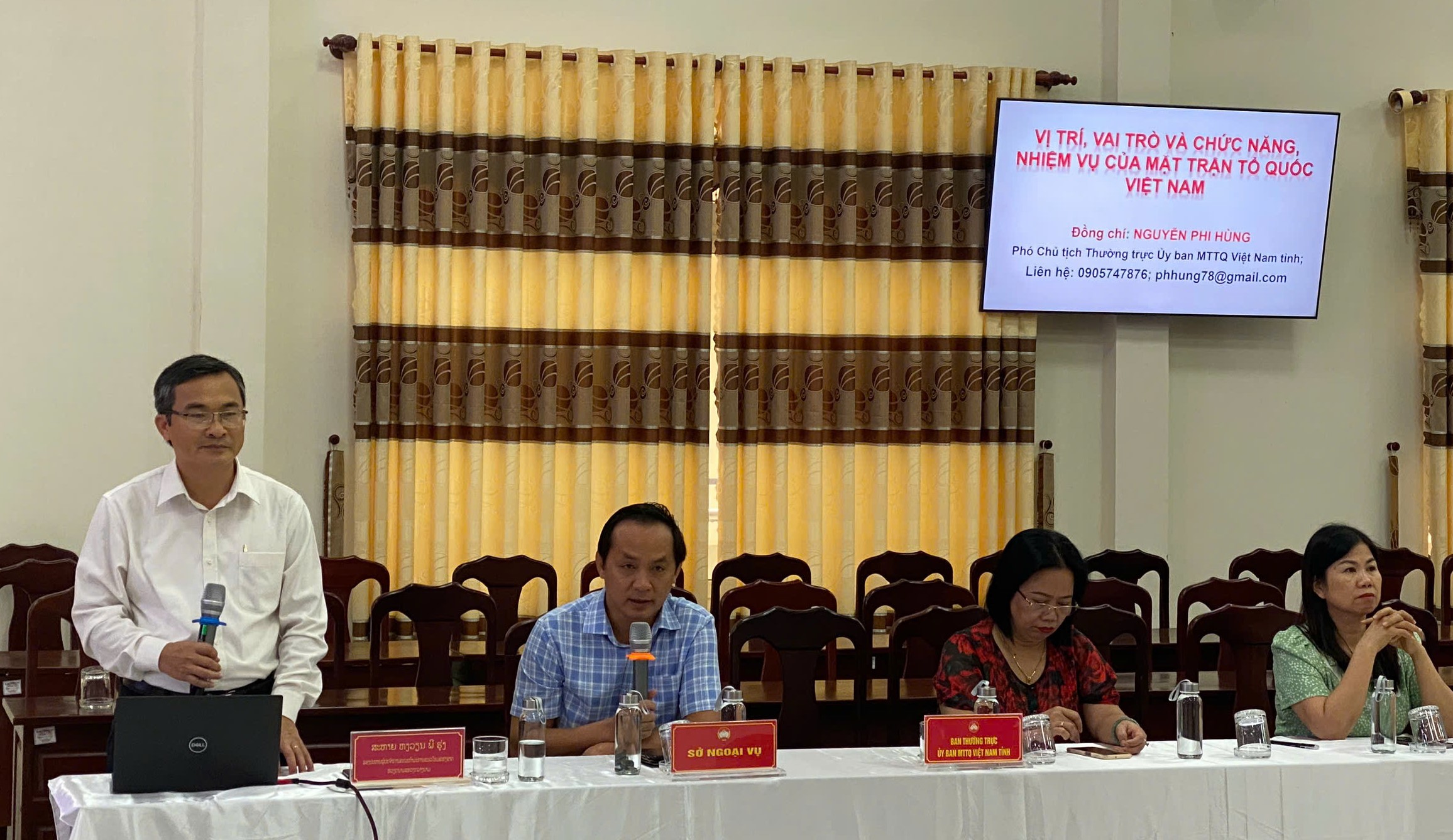 Ông Nguyễn Phi Hùng - Phó Chủ tịch Thường trực Ủy ban MTTQ Việt Nam tỉnh giới thiệu một số nội dung cơ bản về vị trí, vai trò và chức năng, nghiệm vụ của Mặt trận Tổ quốc Việt Nam; chia sẻ một số kinh nghiệm trong việc đổi mới, nâng cao chất lượng hoạt động của Mặt trận để phát huy vai trò nòng cốt chính của Mặt trận Tổ quốc Việt Nam trong giai đoạn mới…