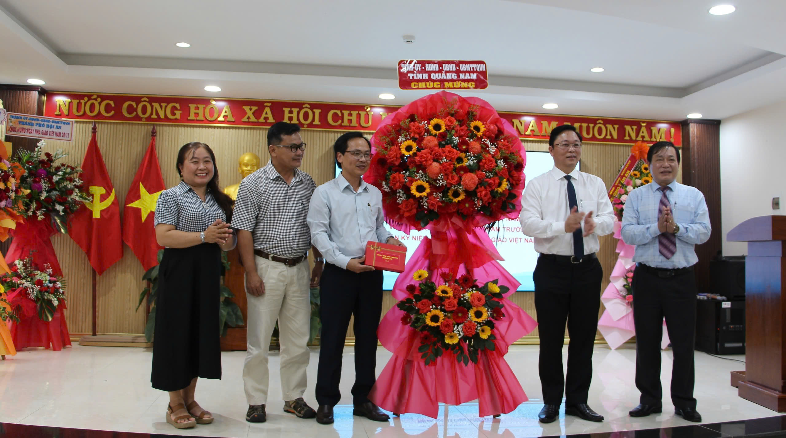 Ông Lê Trí Thanh, UVBTV Tỉnh ủy, Chủ tịch Ủy ban MTTQ Việt tỉnh tặng hoa chúc mừng Trường chuyên Lê Thánh Tông (Hội An)