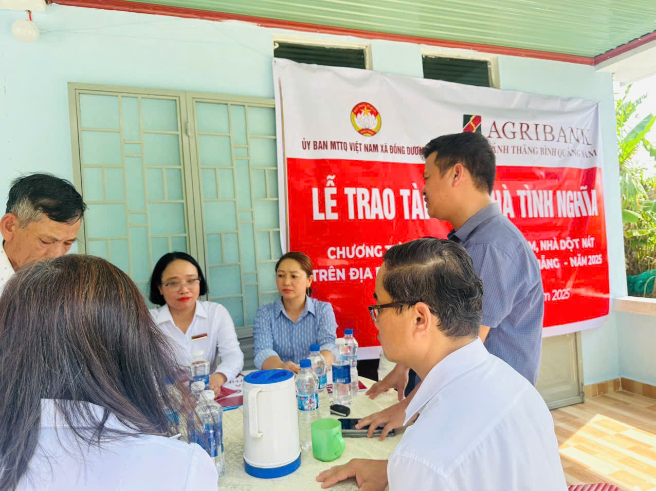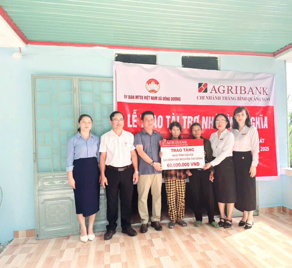 Ủy ban MTTQ Việt Nam xã Đồng Dương vừa phối hợp với Ngân hàng Nông nghiệp và Phát triển nông thôn (Agribank) Chi nhánh Thăng Bình tổ chức nghiệm thu và bàn giao nhà tình nghĩa cho hộ gia đình bà Nguyễn Thị Sành, thuộc diện hộ nghèo trú tại thôn Việt Sơn, xã Đồng Dương.