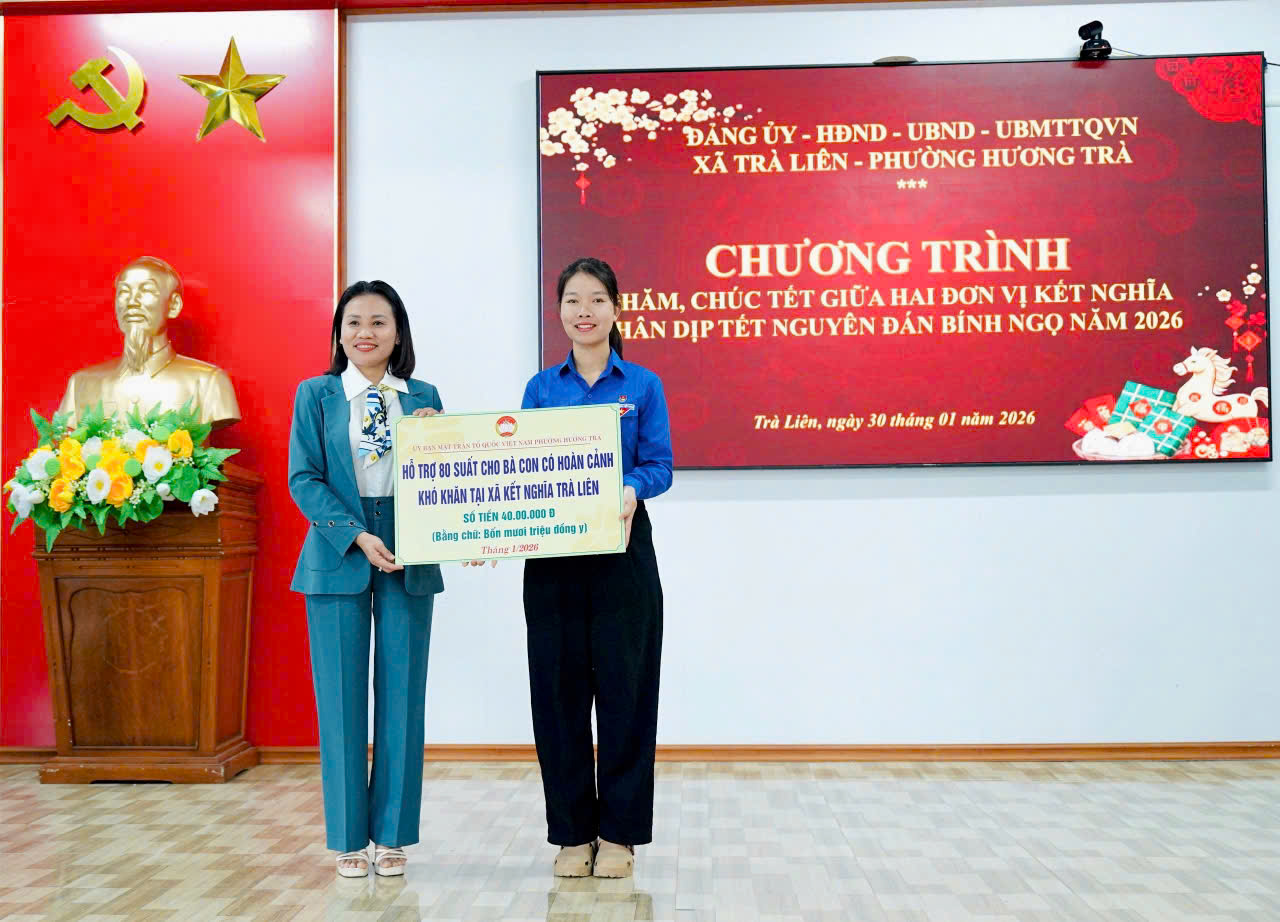 Nhân dịp này, Ủy ban MTTQ Việt Nam phường Hương Trà đã trao tặng 80 suất quà Tết cho các hộ gia đình có hoàn cảnh khó khăn trên địa bàn xã Trà Liên, với tổng kinh phí 40 triệu đồng. Đây là hoạt động thiết thực hưởng ứng Cuộc vận động “Vì người nghèo”, thể hiện vai trò, trách nhiệm của Mặt trận trong công tác chăm lo an sinh xã hội, kịp thời động viên các hộ nghèo, hộ cận nghèo, hộ có hoàn cảnh khó khăn vươn lên ổn định cuộc sống, vui Xuân, đón Tết đầm ấm.