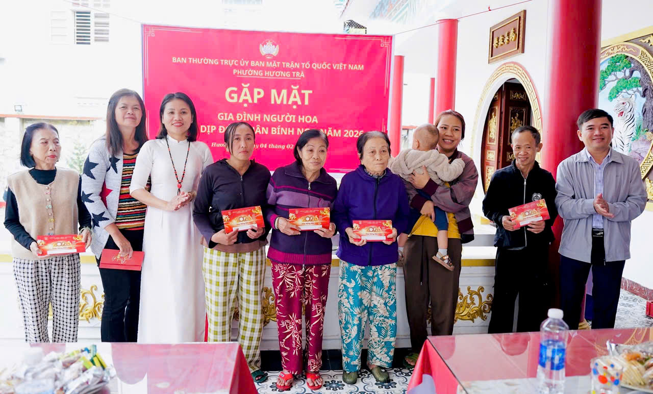 Dịp này, Ủy ban MTTQ Việt Nam phường Hương Trà đã trao tặng quà Tết cho Quỳnh Phủ Hội quán và 15 suất quà cho các hộ gia đình người Hoa có hoàn cảnh khó khăn, thể hiện sự quan tâm, chăm lo của cấp ủy Đảng, chính quyền và Mặt trận đối với đồng bào người Hoa trên địa bàn.